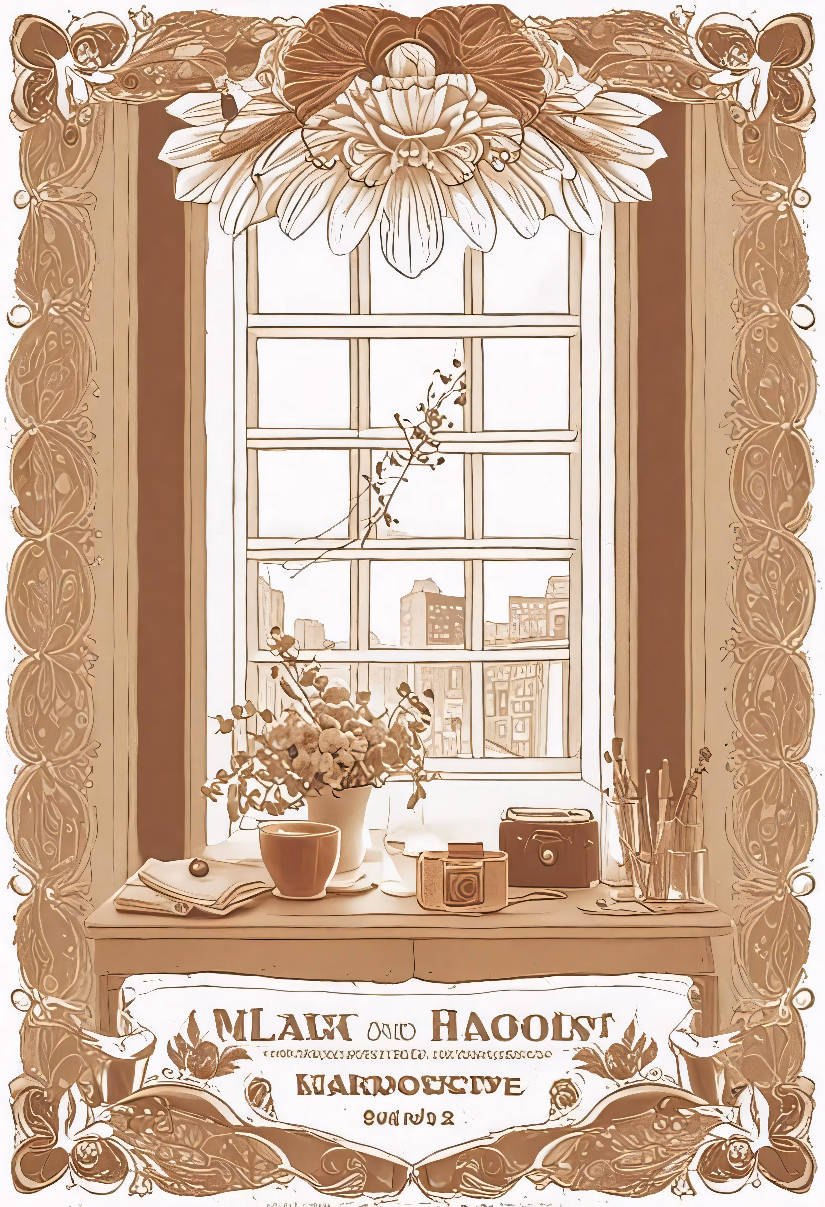 High resolution picture, free to use, a poster showing the window with the words, walk the room, and a table with flowers