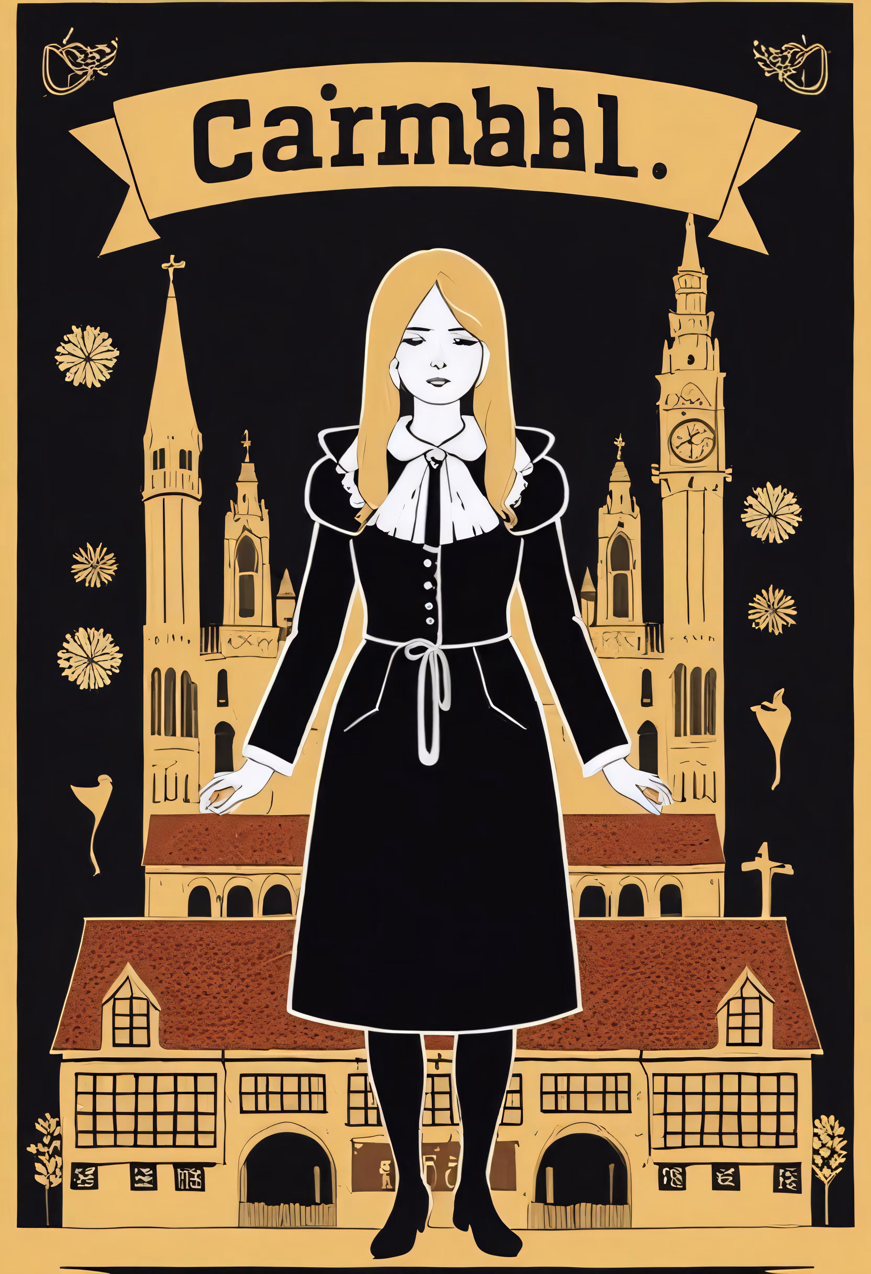 High resolution picture, free to use, a poster with a girl in front of some buildings
