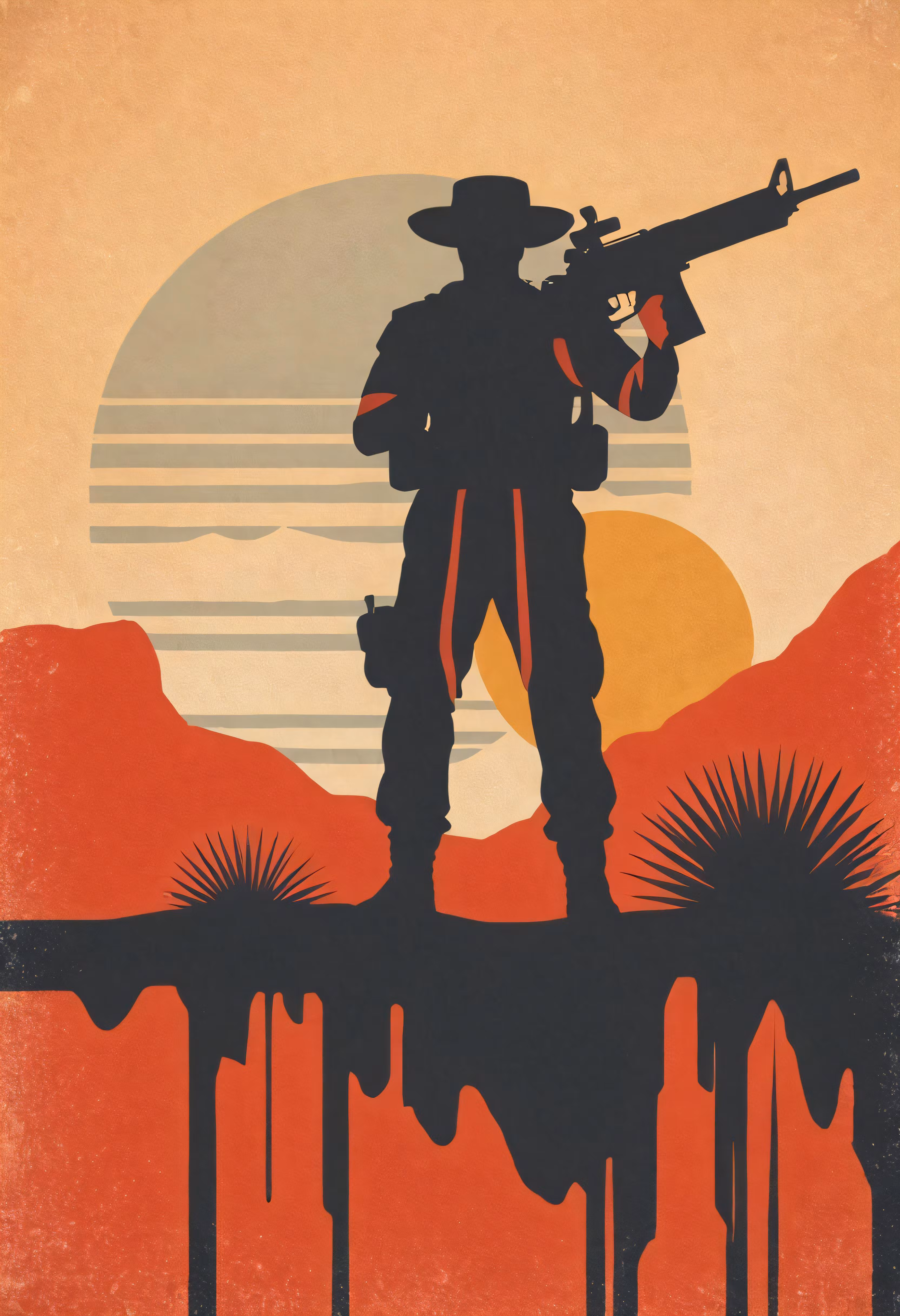 High resolution picture, free to use, a poster with the silhouette of a soldier holding a gun
