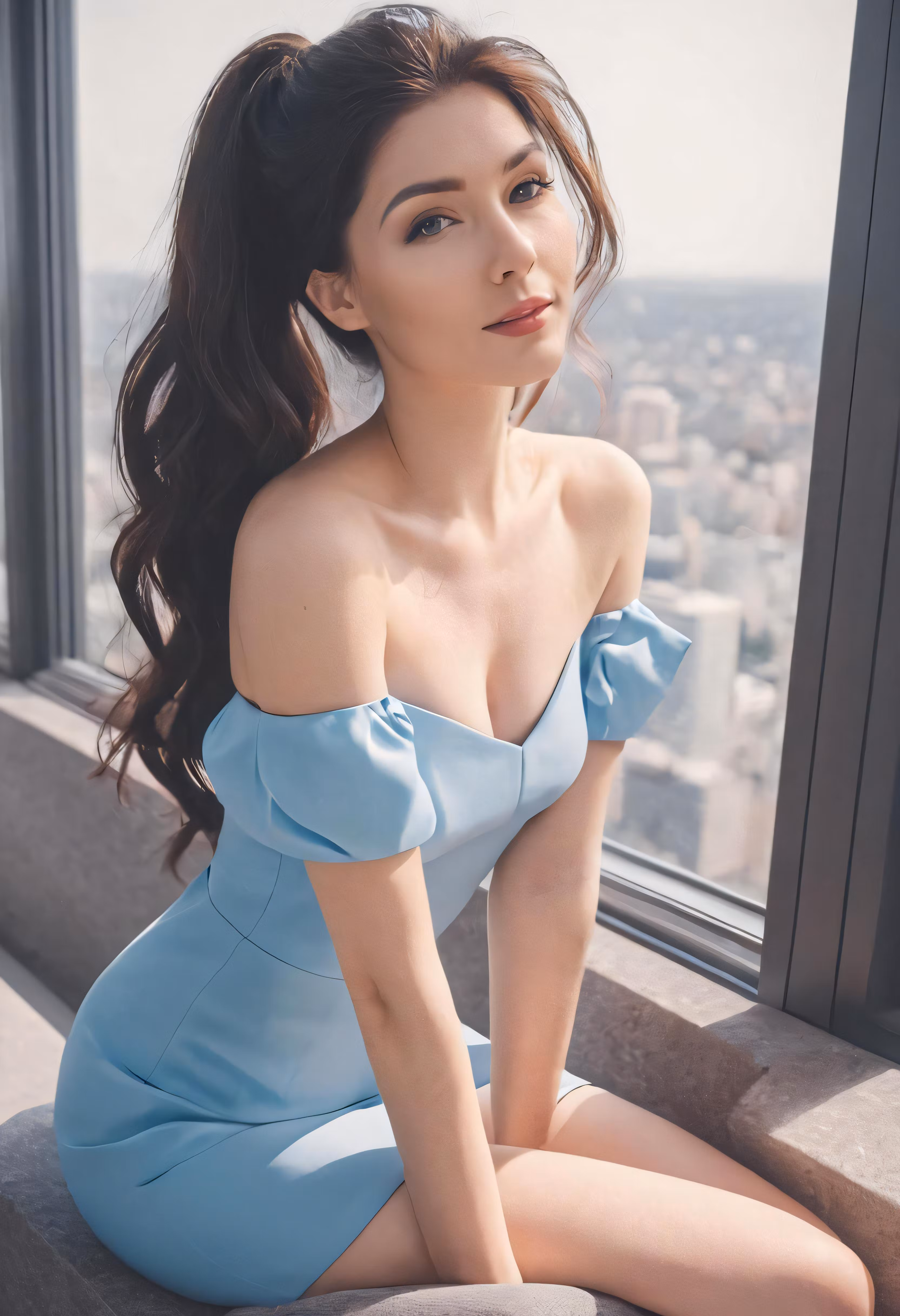 High resolution picture, free to use, a pretty lady with large breast sitting on a ledge