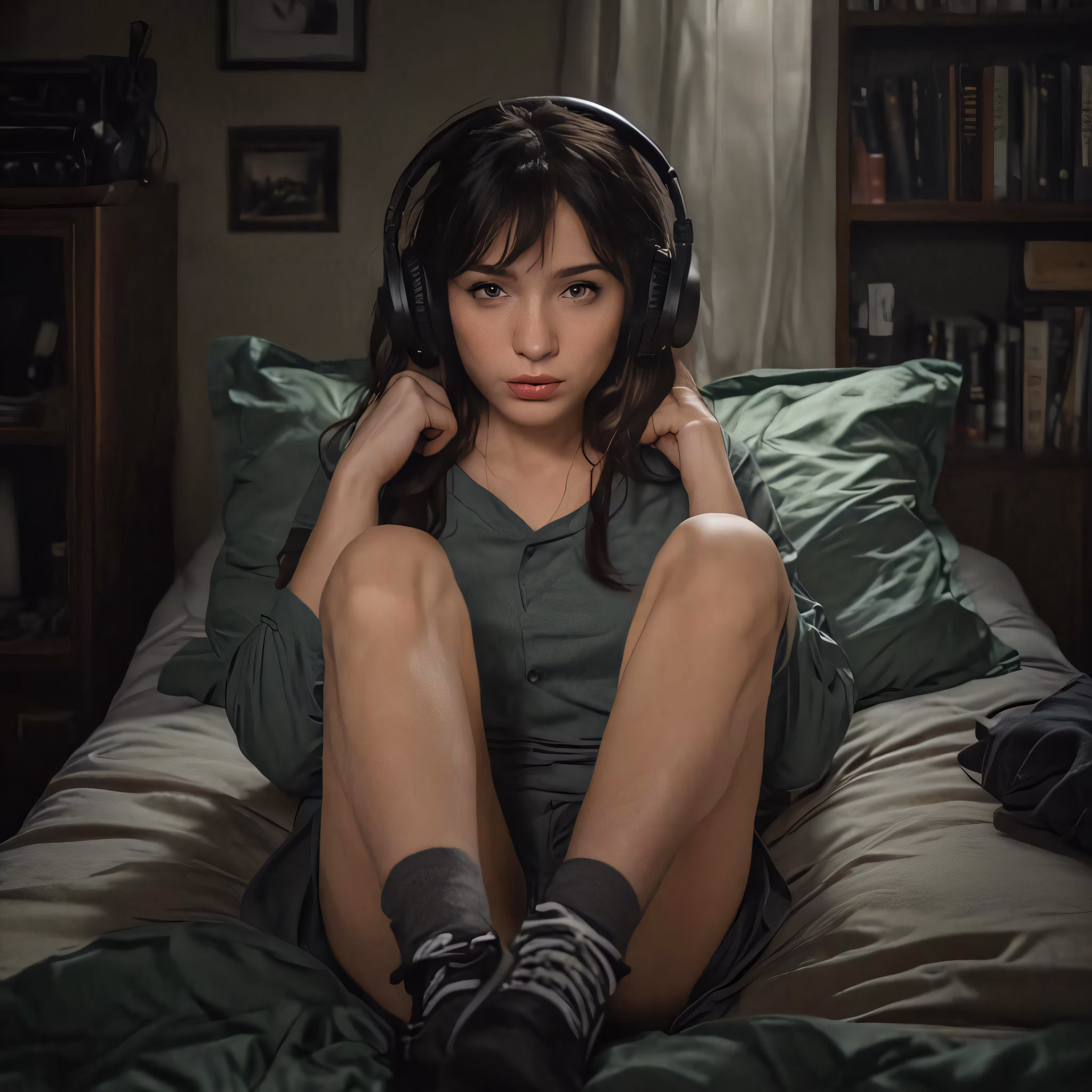 High resolution picture, free to use, a pretty woman sitting on top of a bed wearing headphones