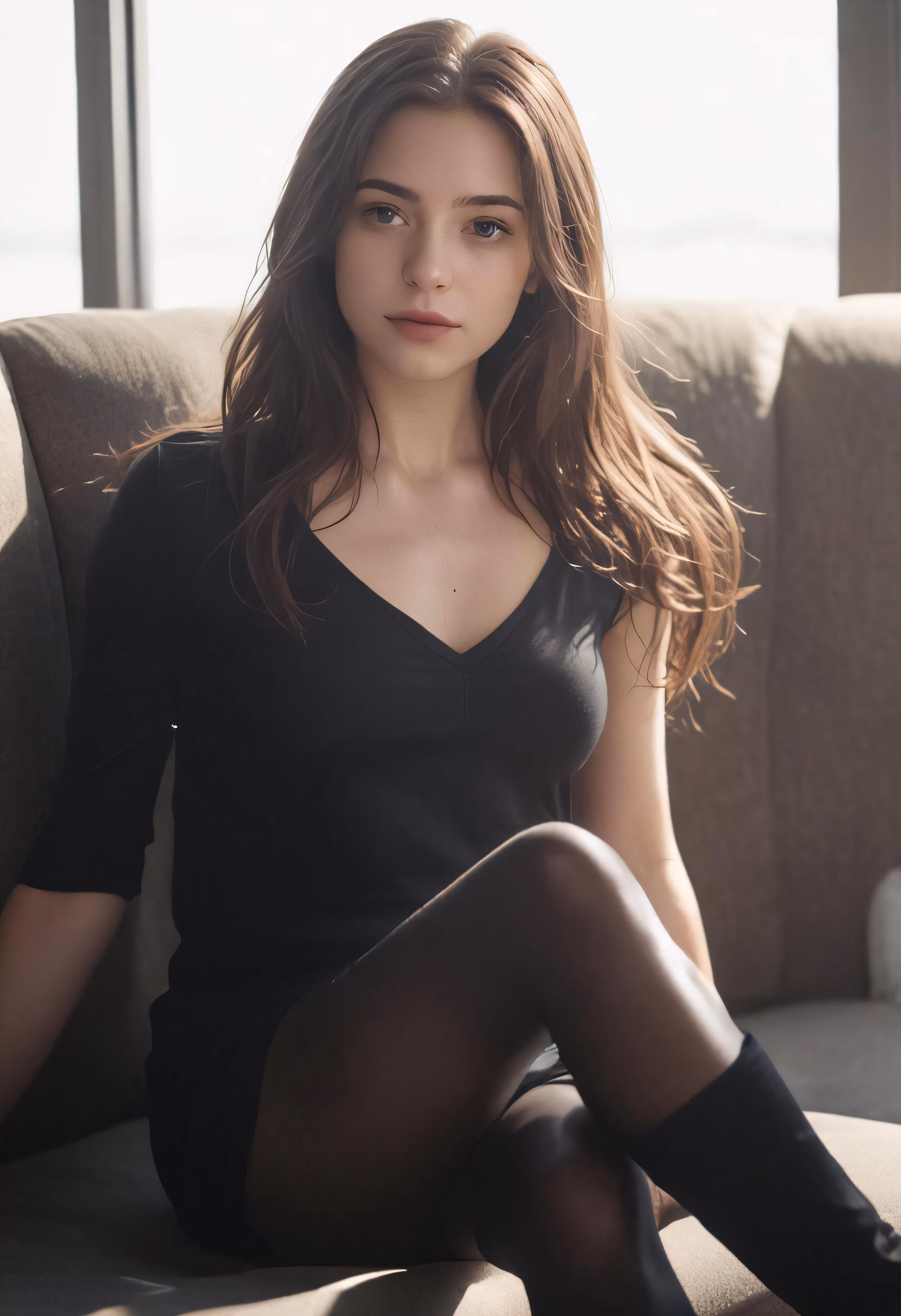 High resolution picture, free to use, a pretty young woman in black outfit sitting on a sofa