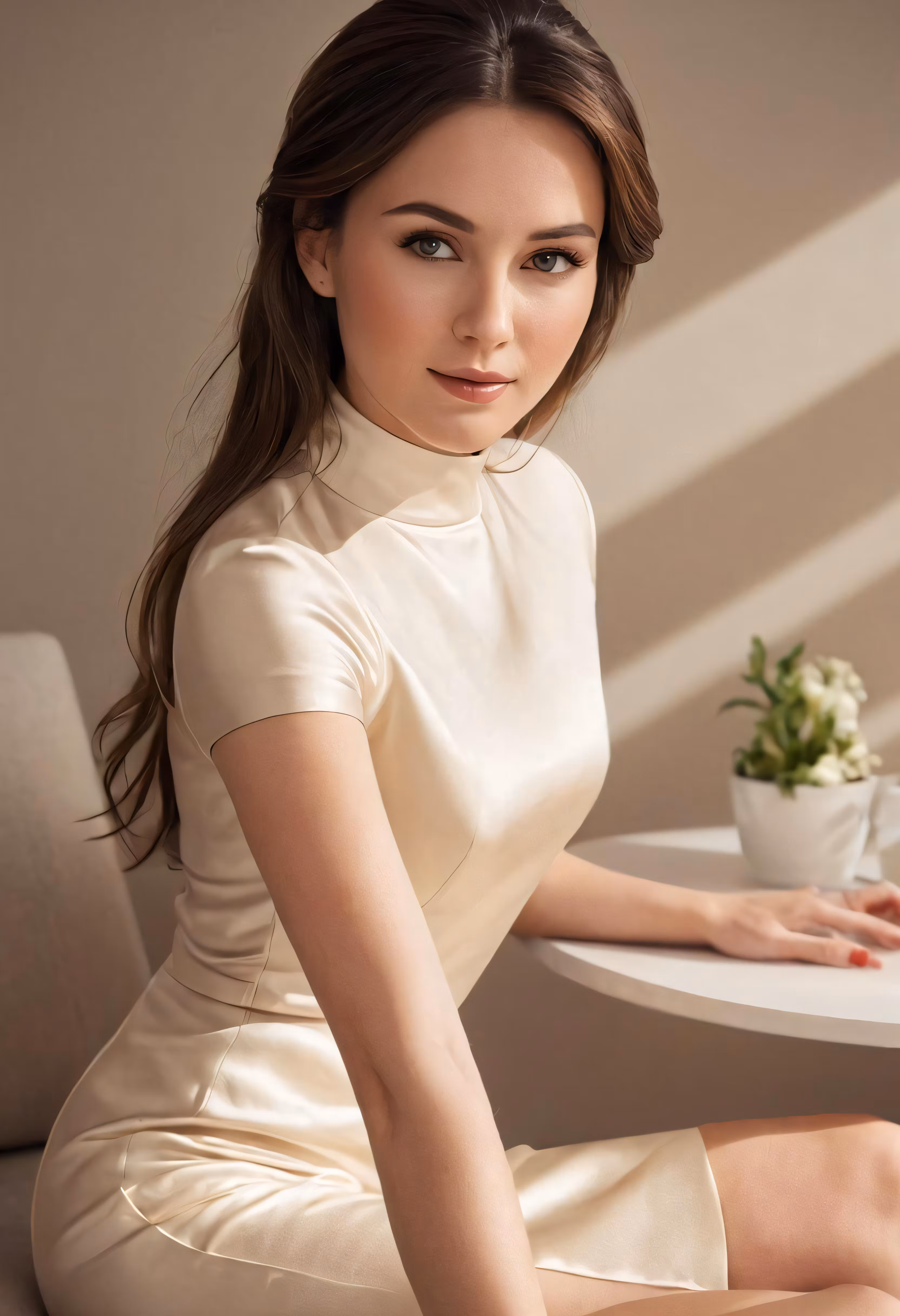 High resolution picture, free to use, a pretty young woman wearing high heels and dress sitting at a table