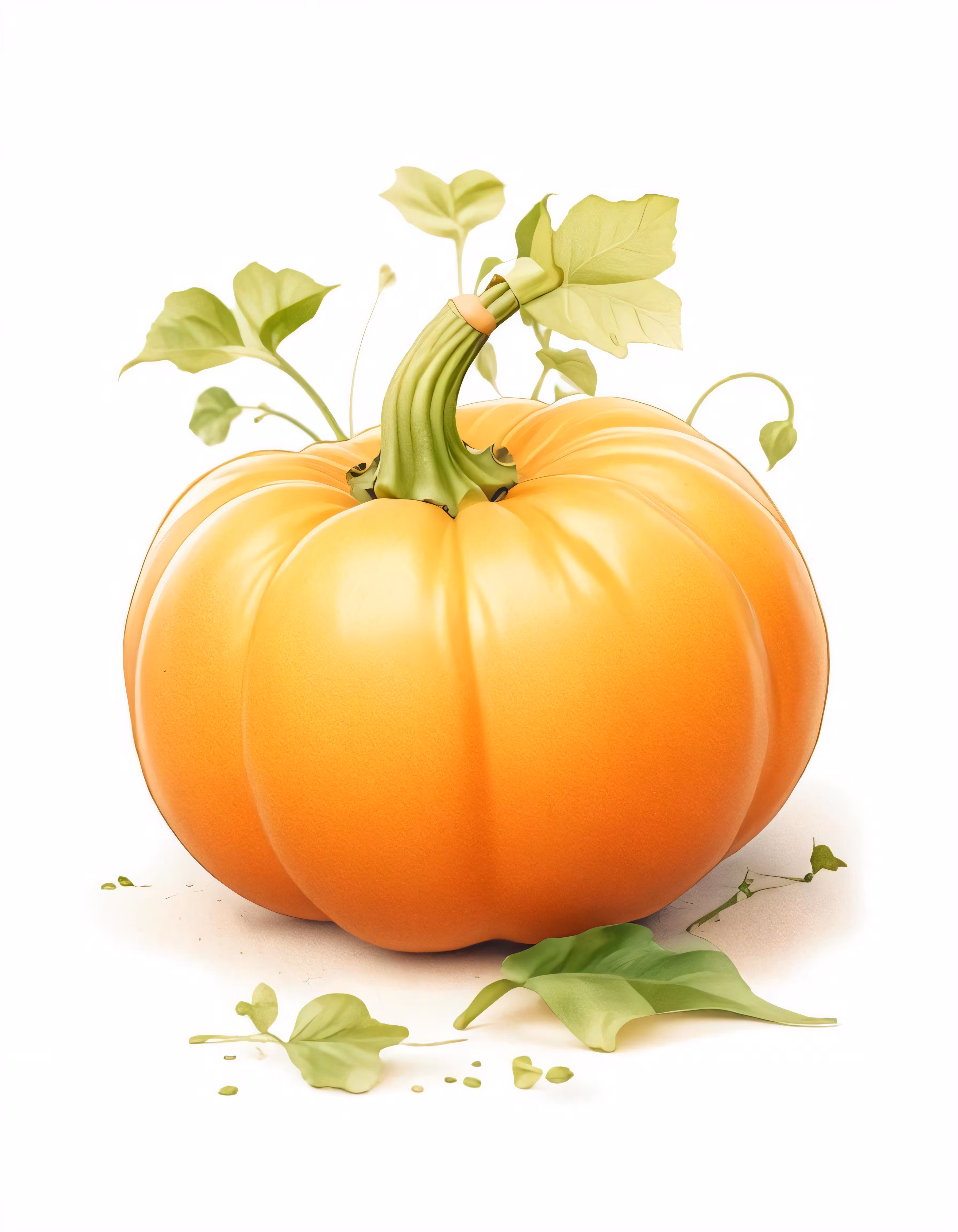 High resolution picture, free to use, a pumpkin with leaves on it on a white surface