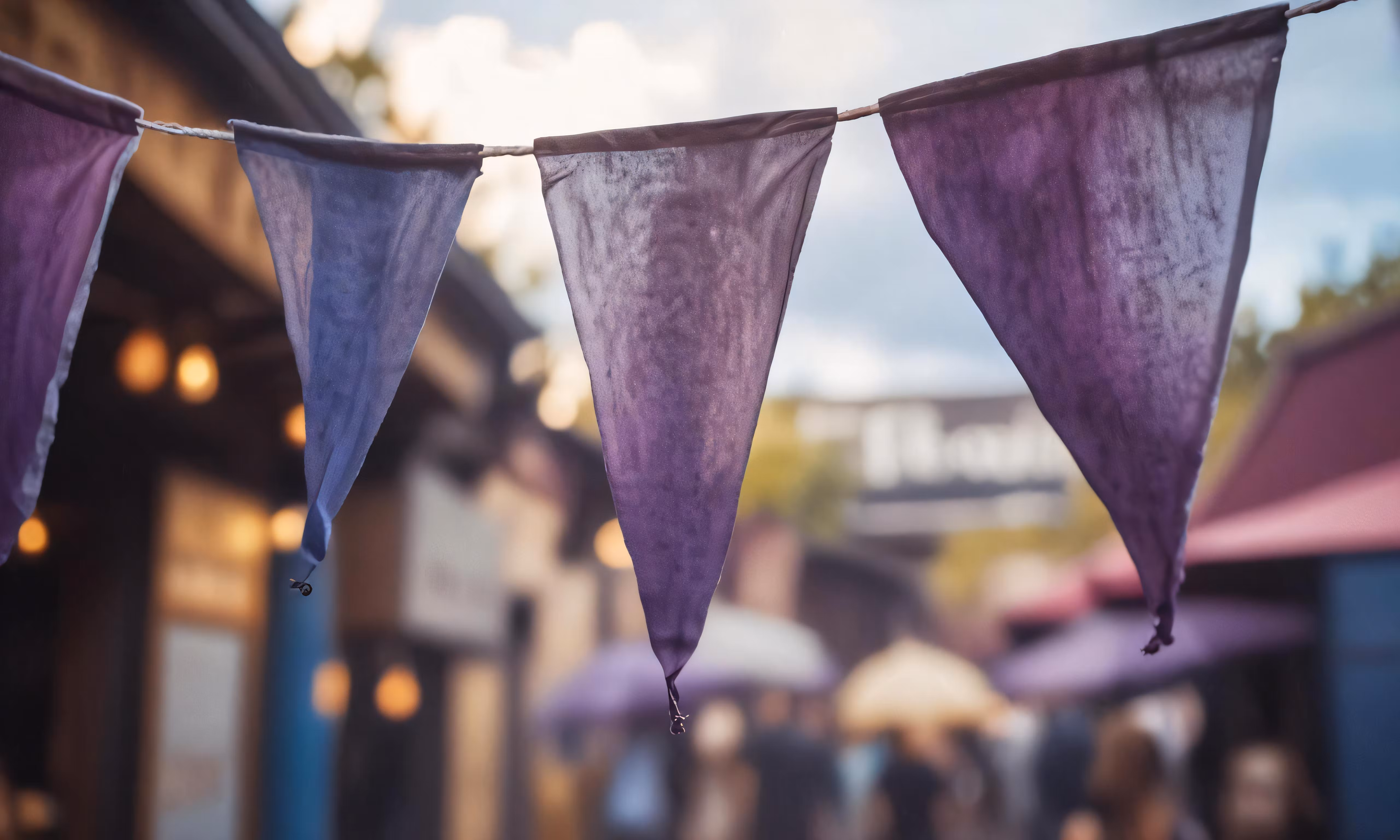 High resolution picture, free to use, a purple and black towel hangs in the air near a store