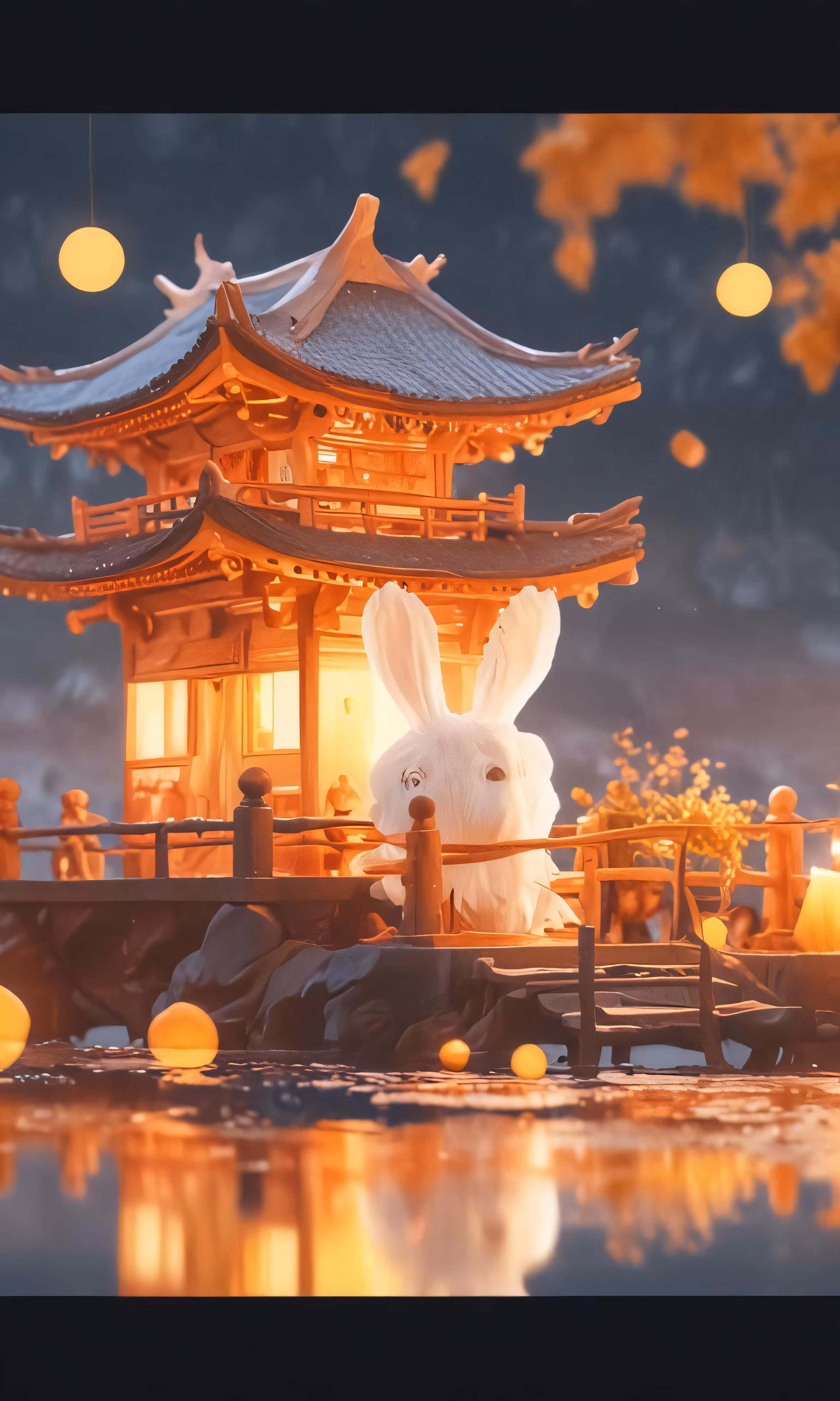 High resolution picture, free to use, a rabbit in front of a pagoda with lights around it