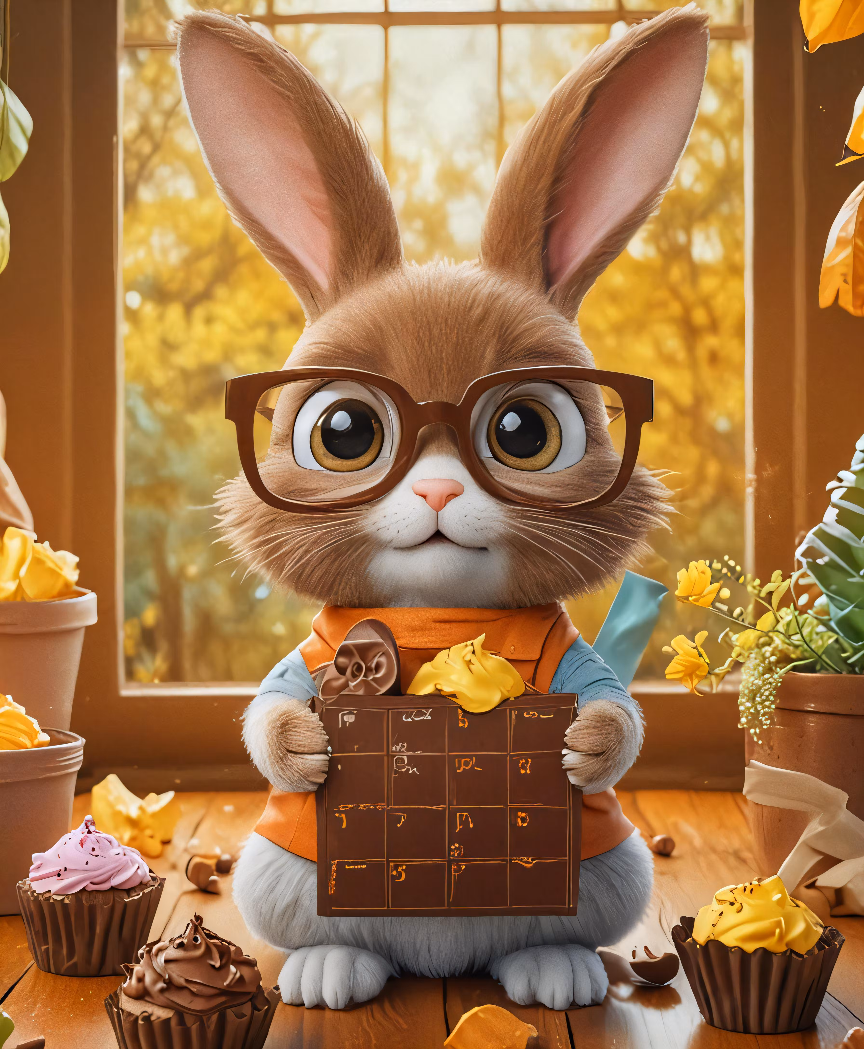 High resolution picture, free to use, a rabbit is dressed as a little chick holding a chocolate calendar