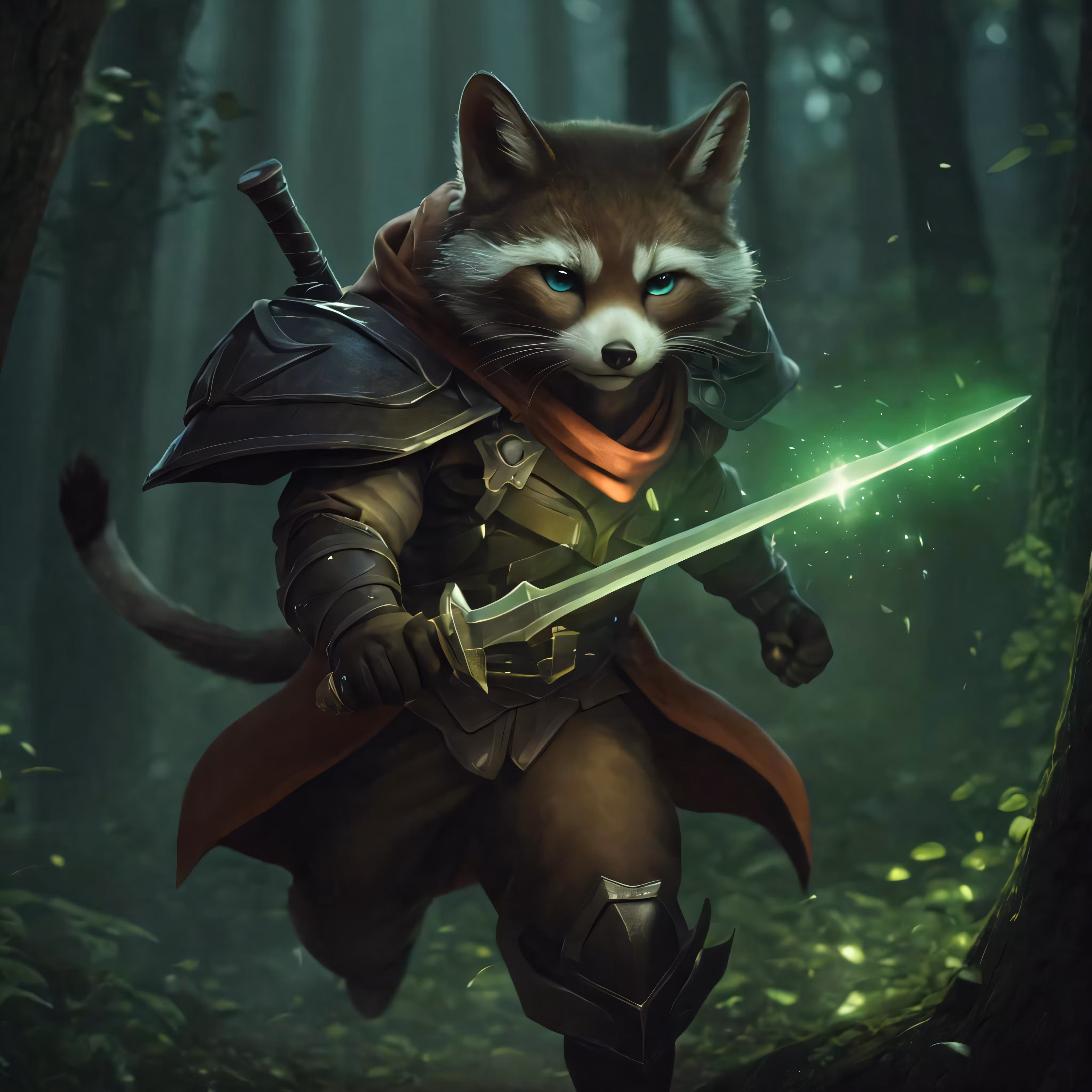 High resolution picture, free to use, a racoon is holding a green and glowing sword in the woods