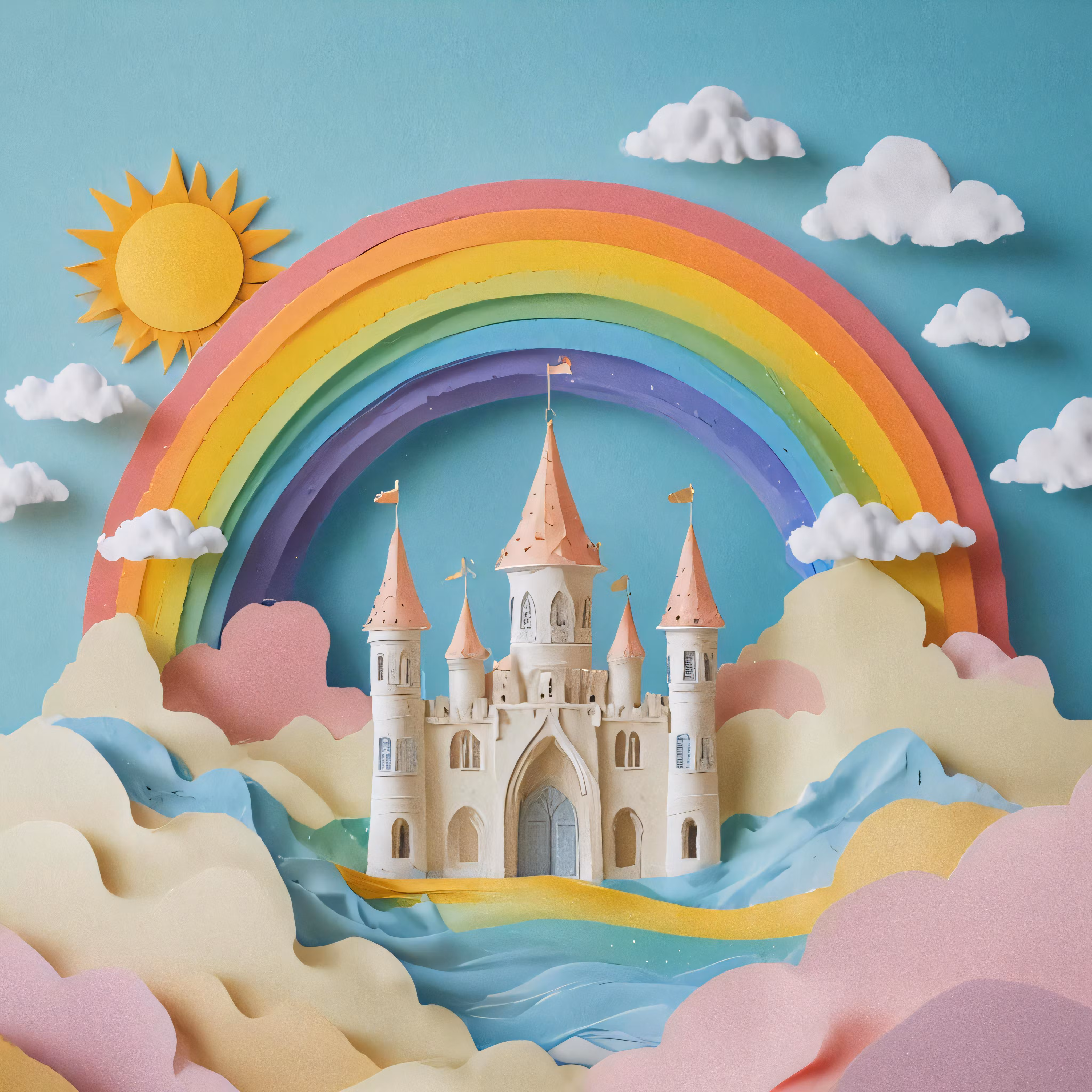 High resolution picture, free to use, a rainbow with a castle on it in front of clouds