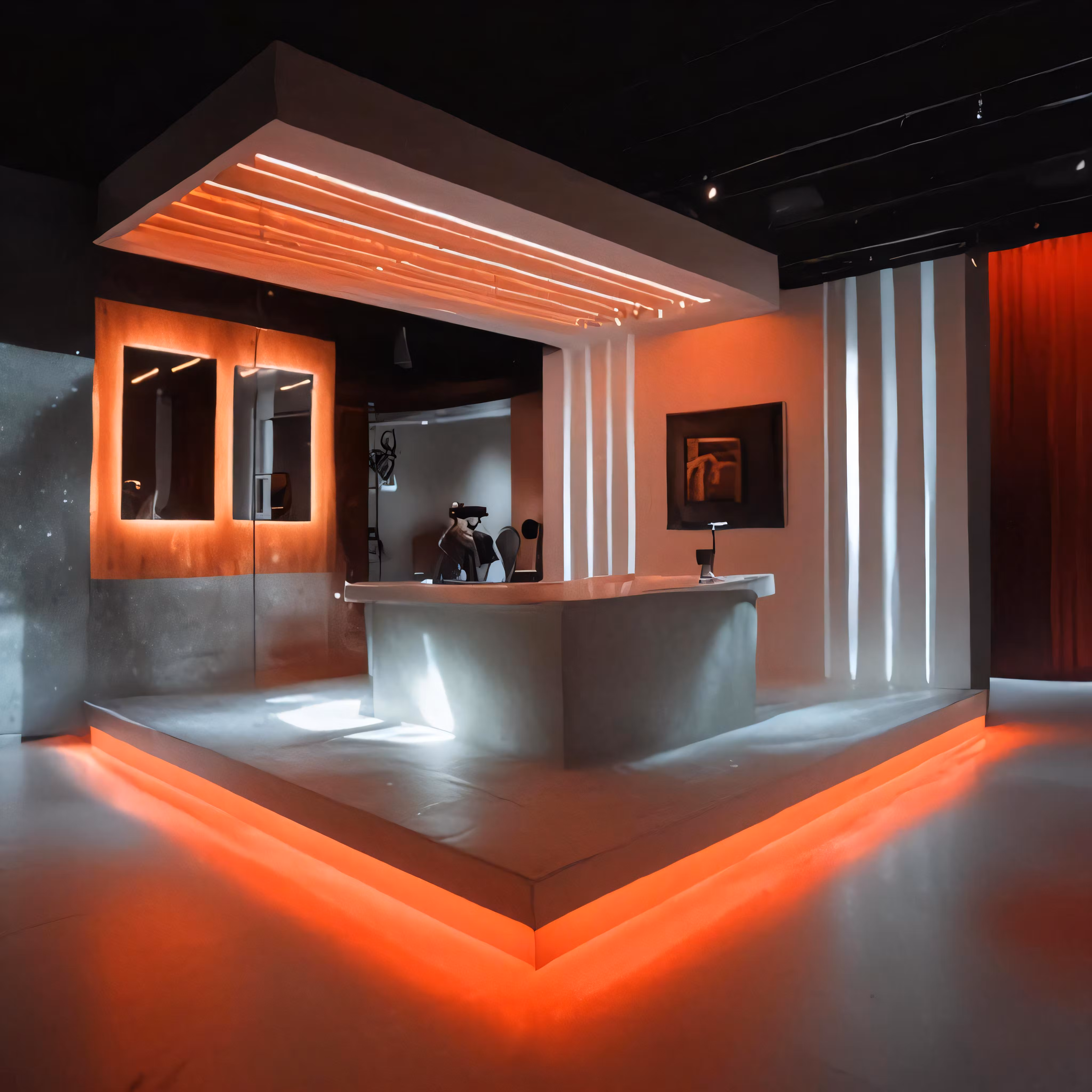 High resolution picture, free to use, a reception area lit with orange lights in the night