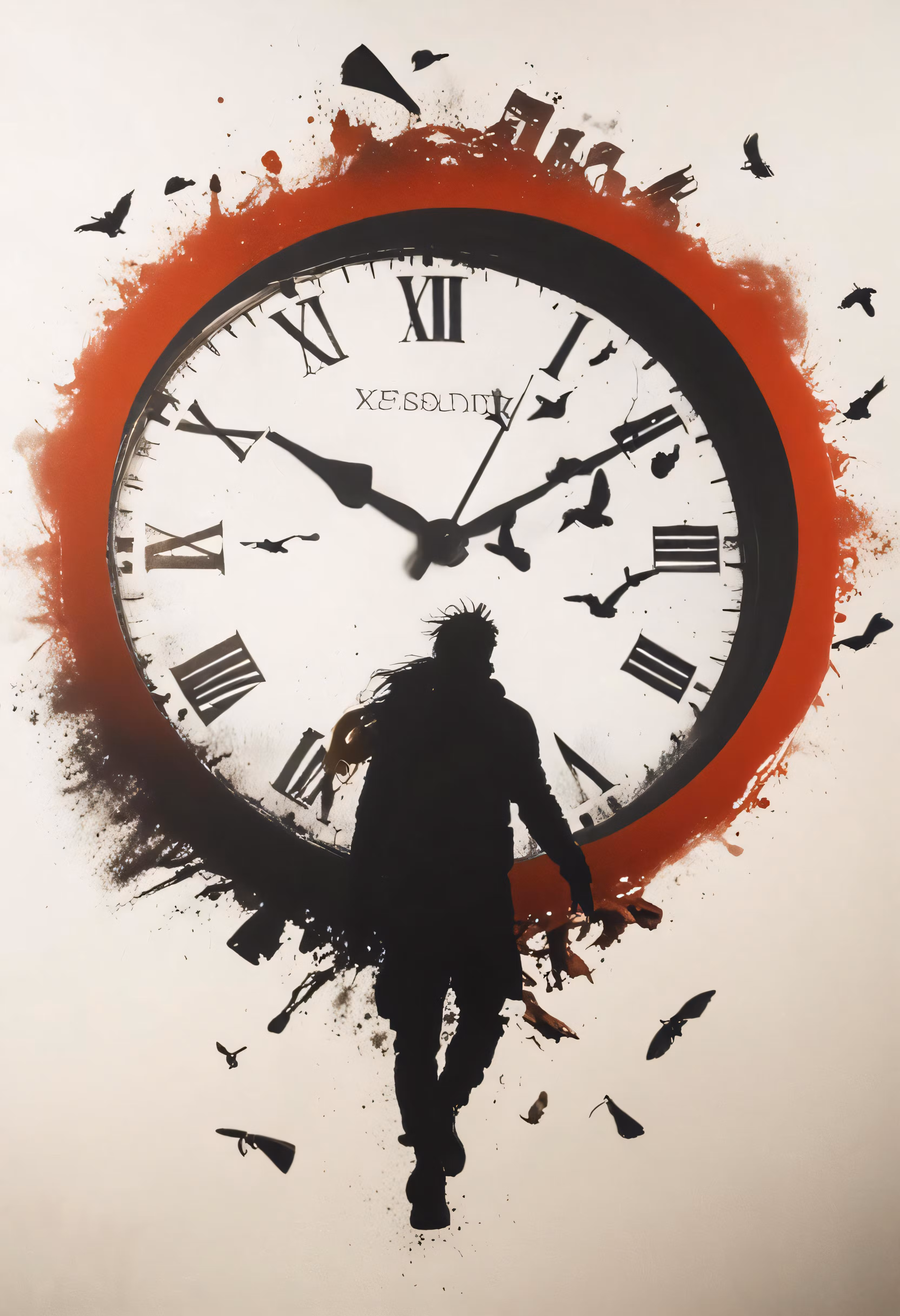 High resolution picture, free to use, a red and black clock has a silhouette of a man walking