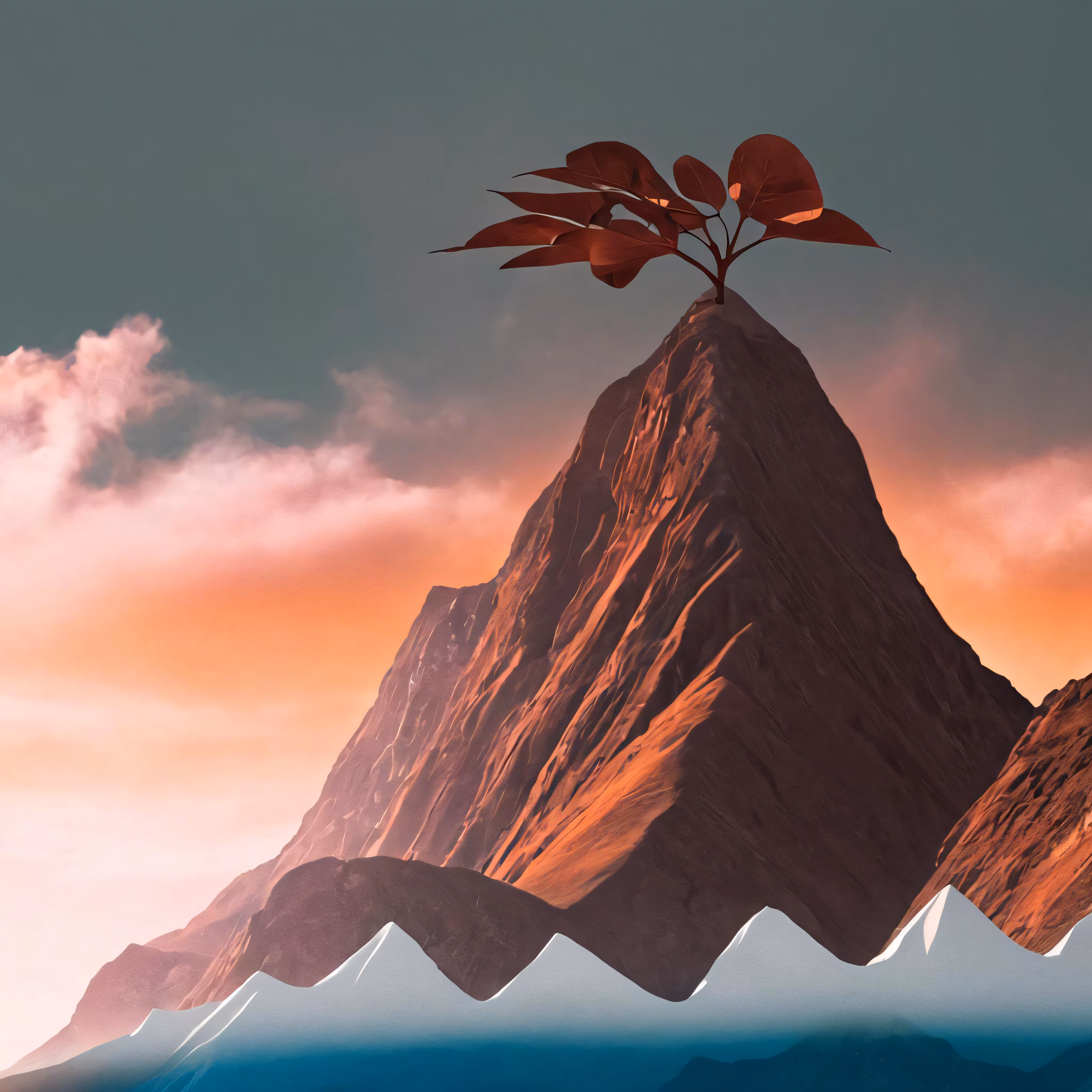 High resolution picture, free to use, a red and gold art piece of a mountain with a tree on top