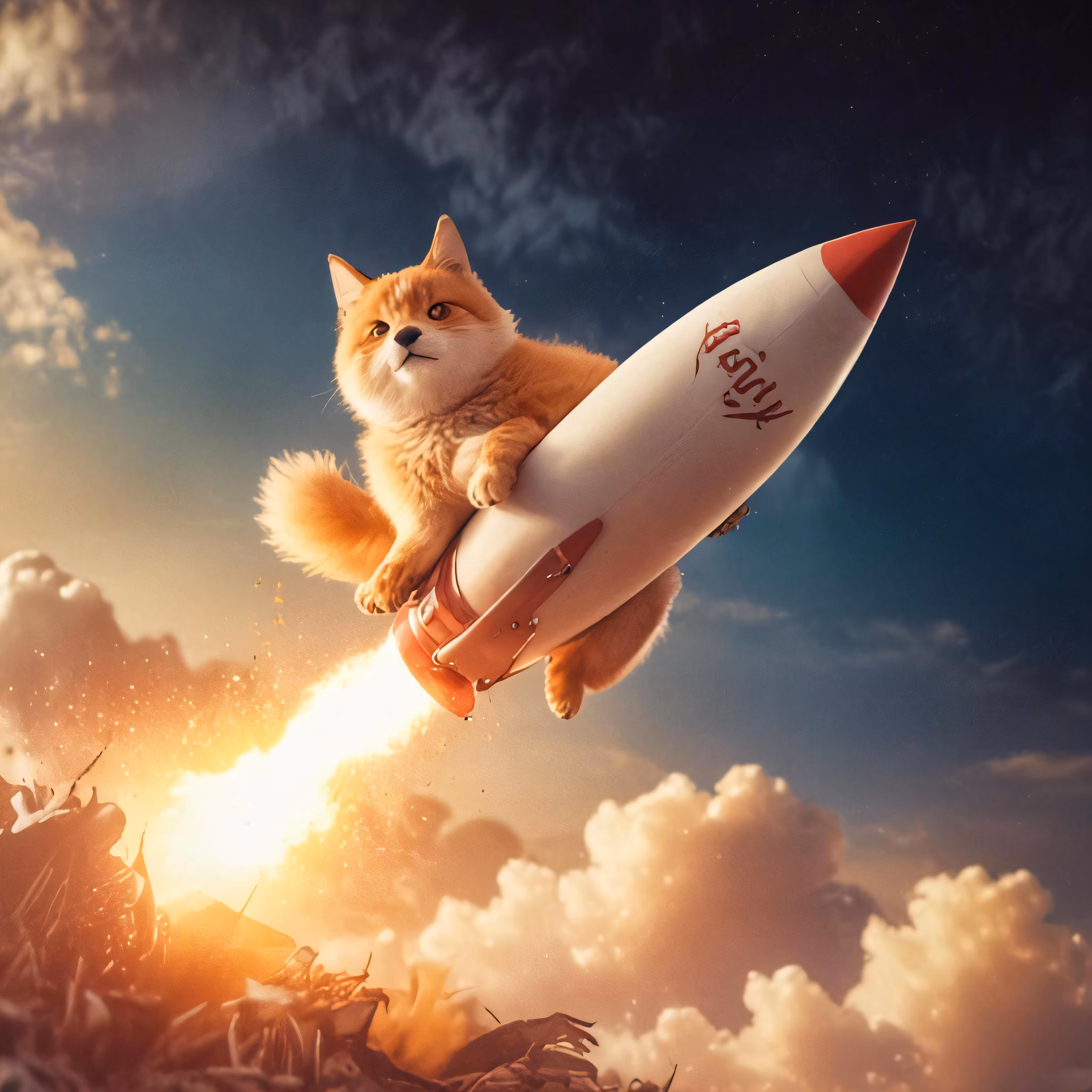 High resolution picture, free to use, a red and white kitten sitting on top of a rocket in the sky