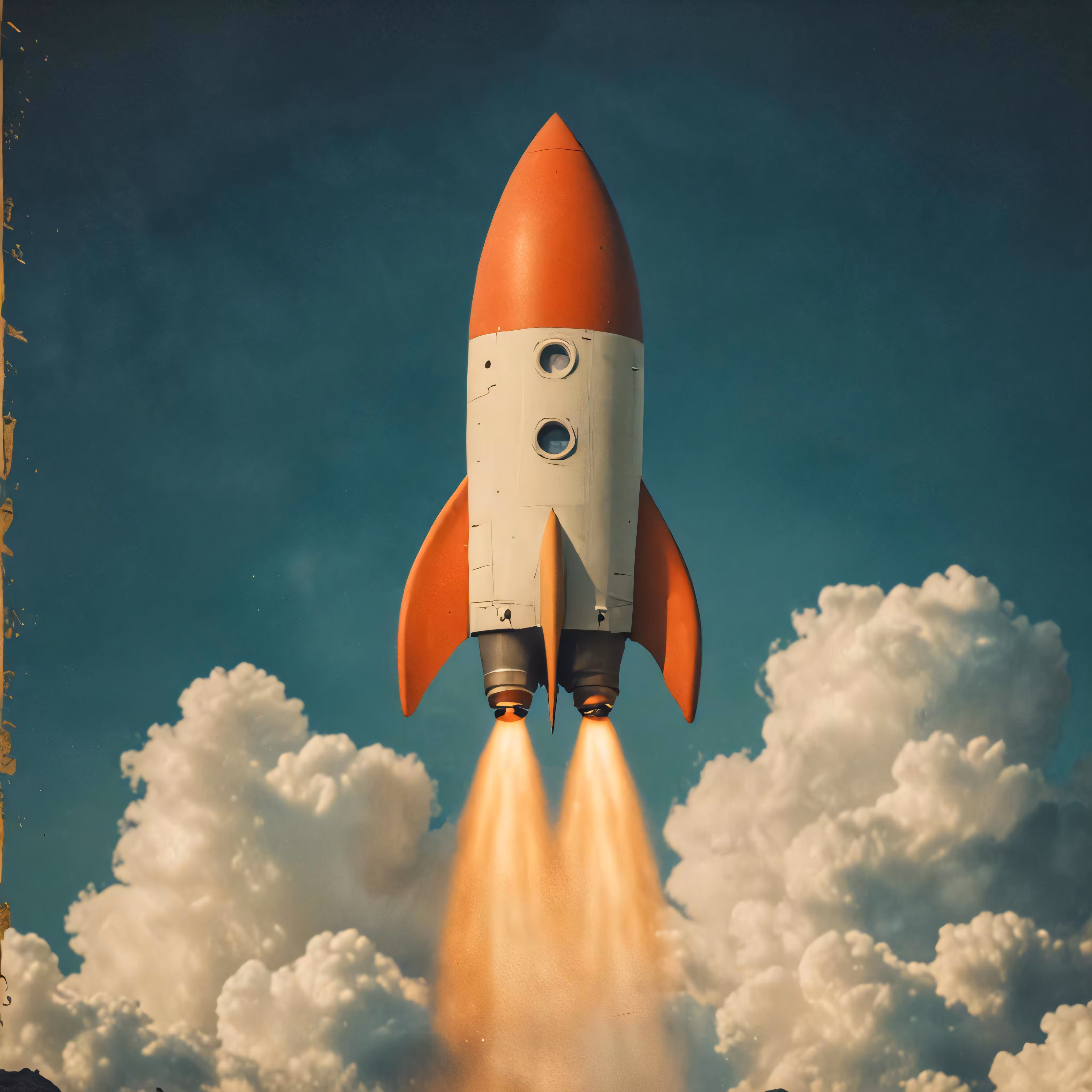 High resolution picture, free to use, a red and white rocket lifts off into the sky