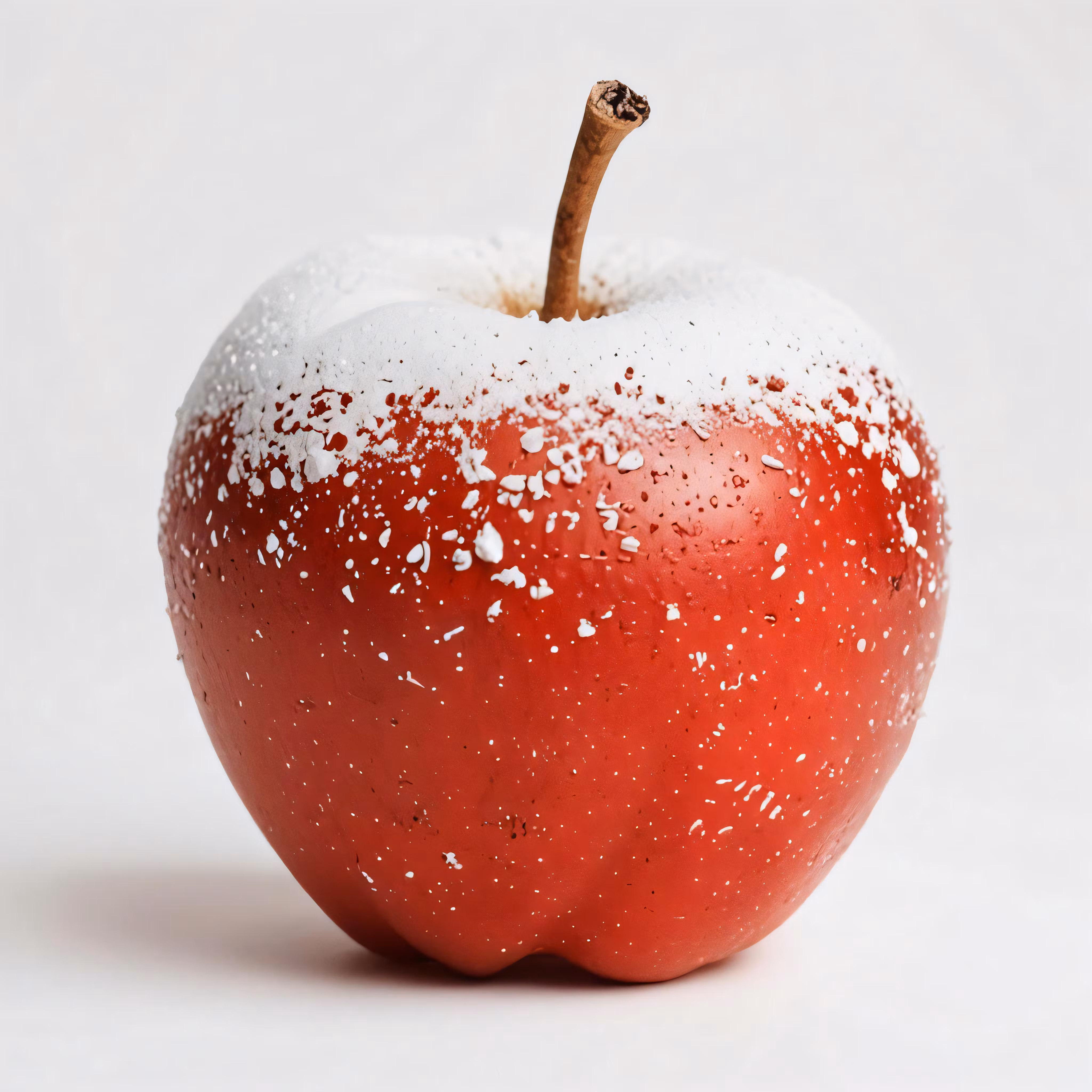 High resolution picture, free to use, a red apple with white sprinkles is sitting on a white table