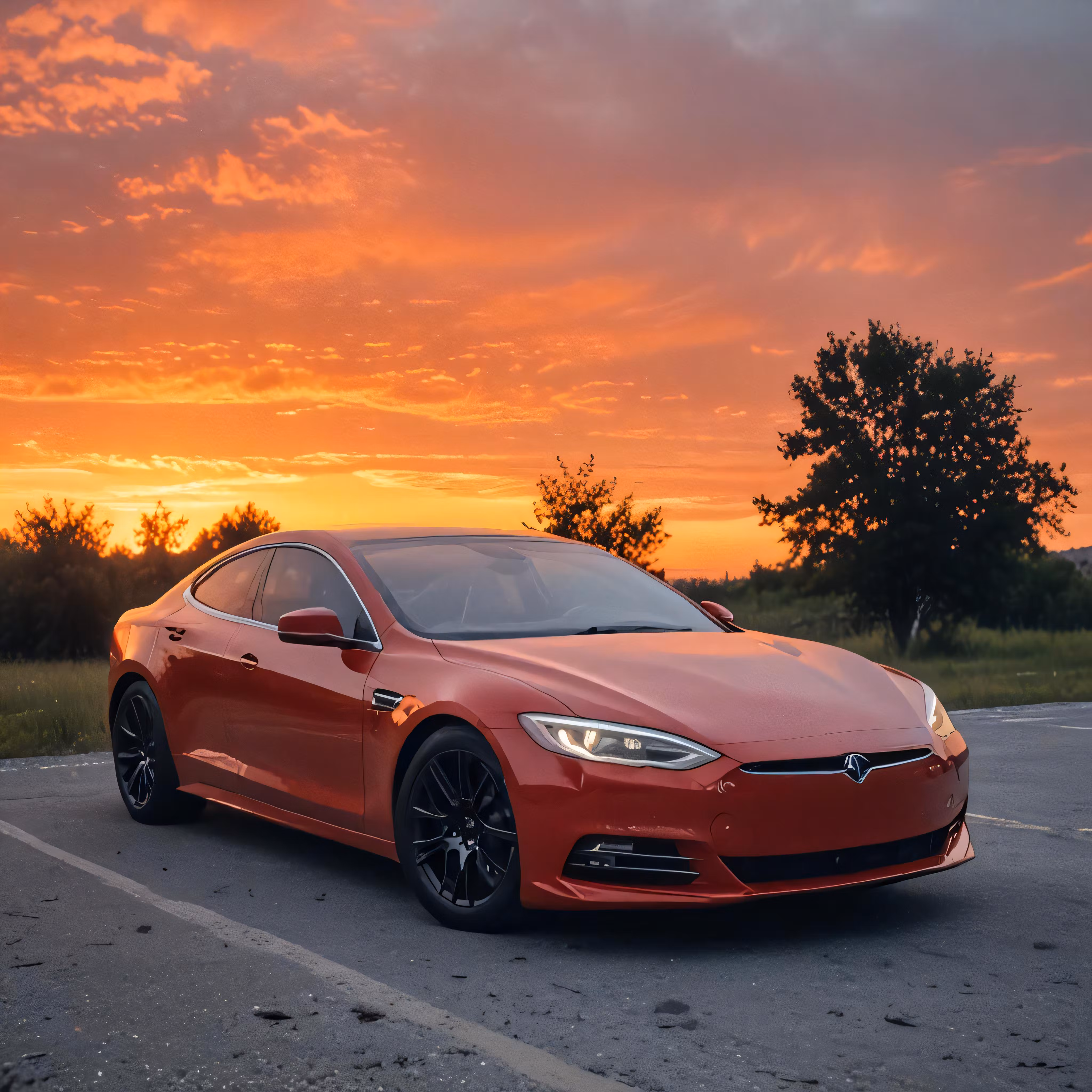 High resolution picture, free to use, a red car is sitting on the road in the sunset