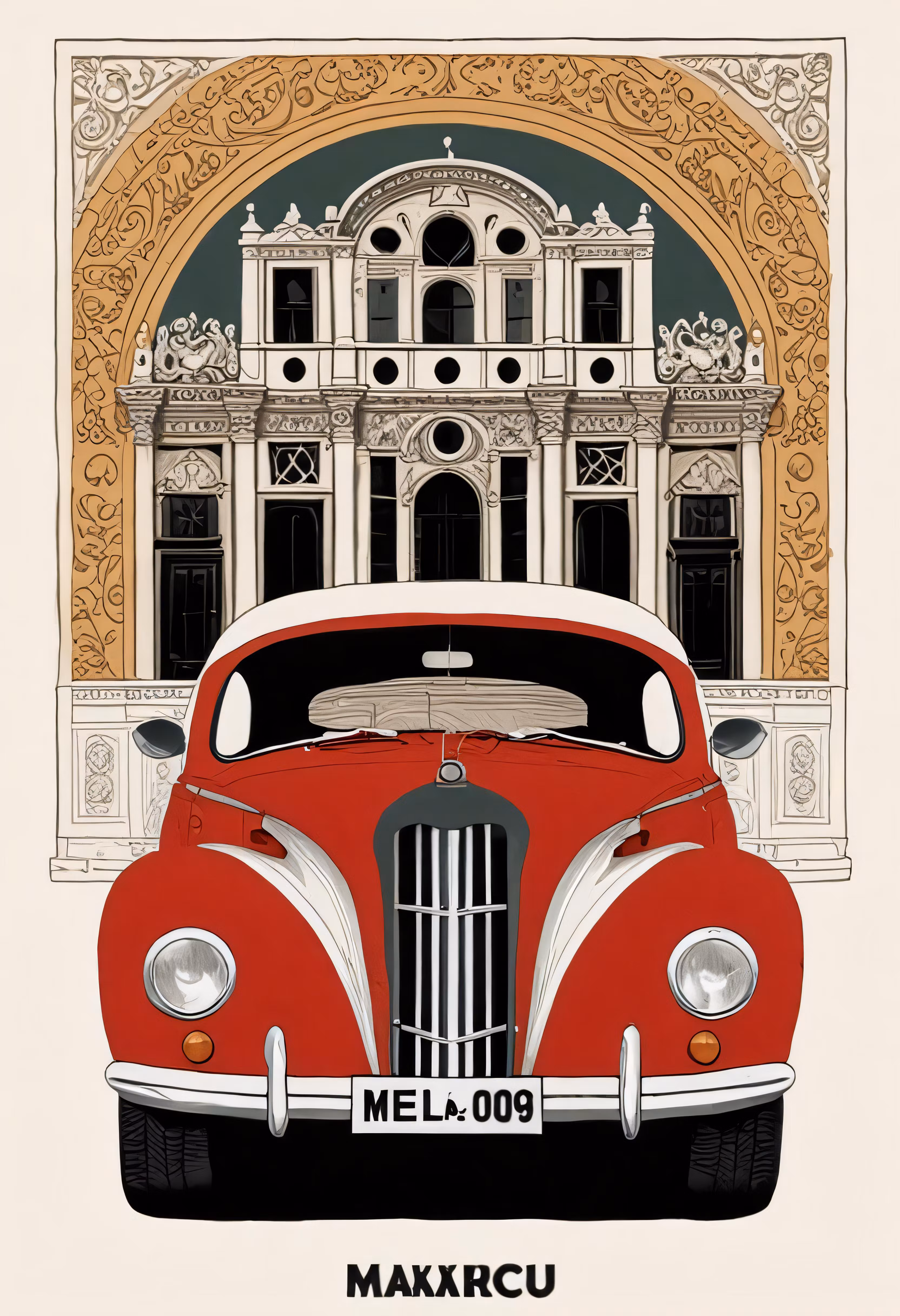 High resolution picture, free to use, a red classic car in front of a mansion