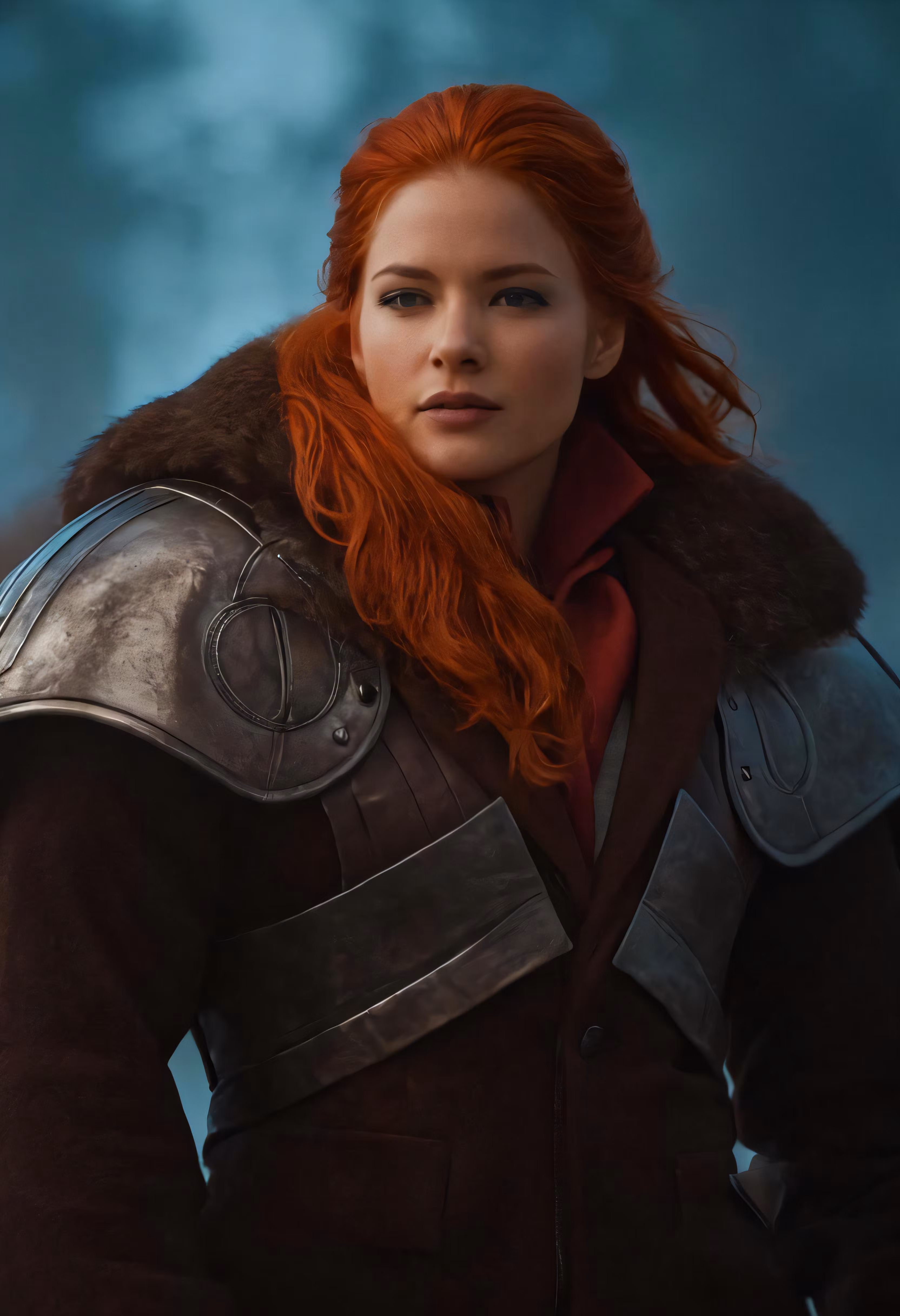 High resolution picture, free to use, a red headed woman in armor posing for a photo