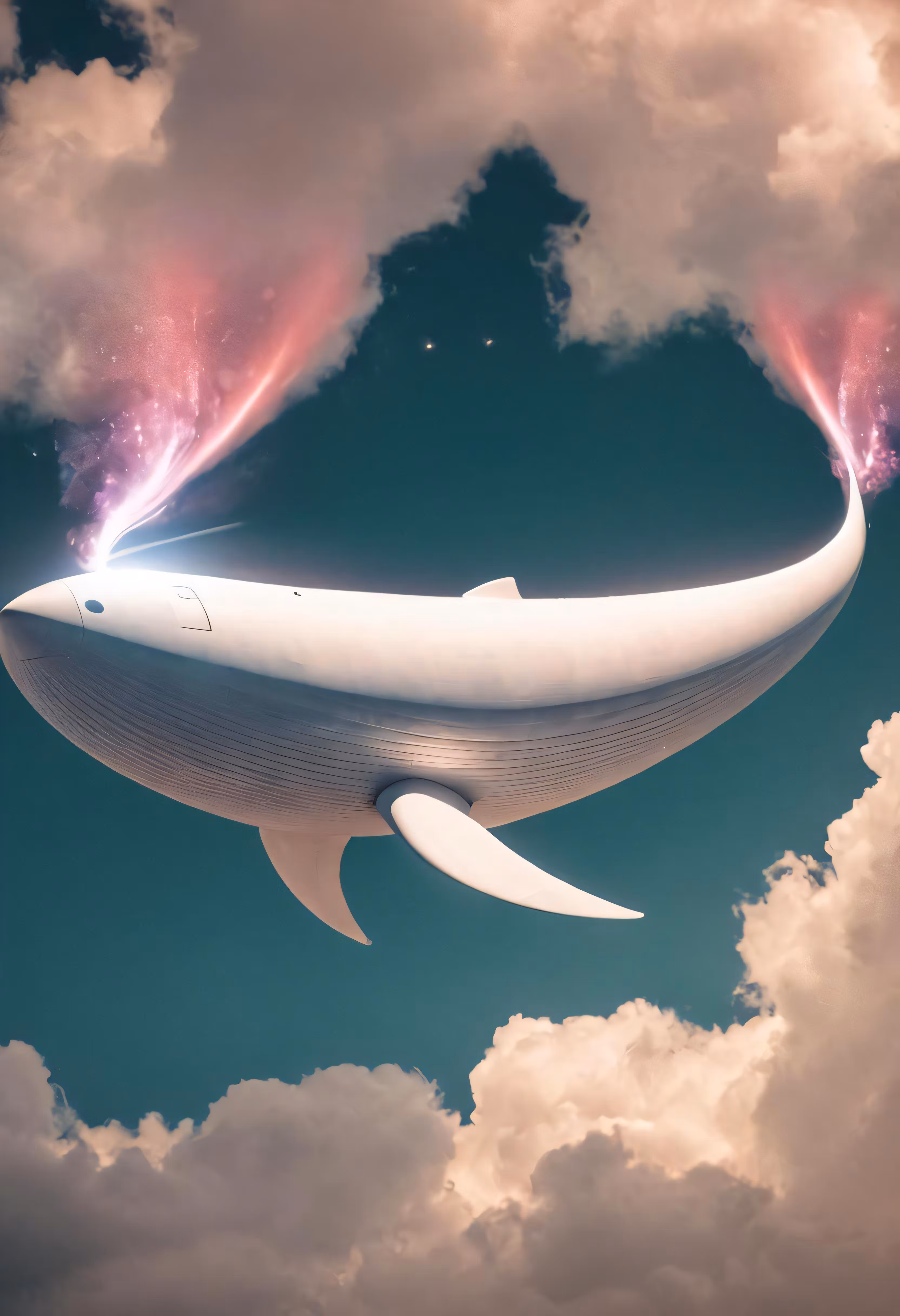 High resolution picture, free to use, a rendering of a spaceship floating in the sky with two red lights above