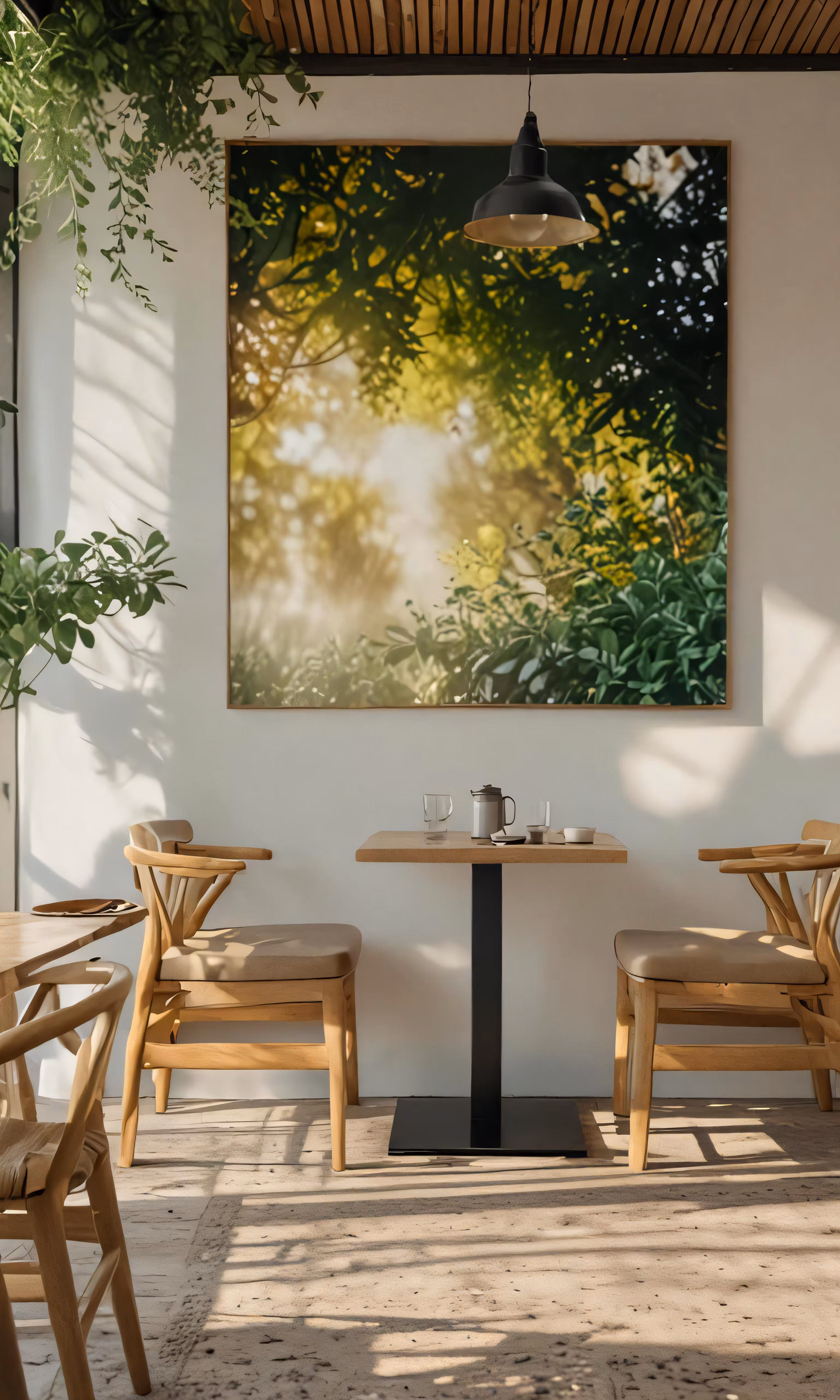 High resolution picture, free to use, a restaurant with the sunlight shining through the leaves
