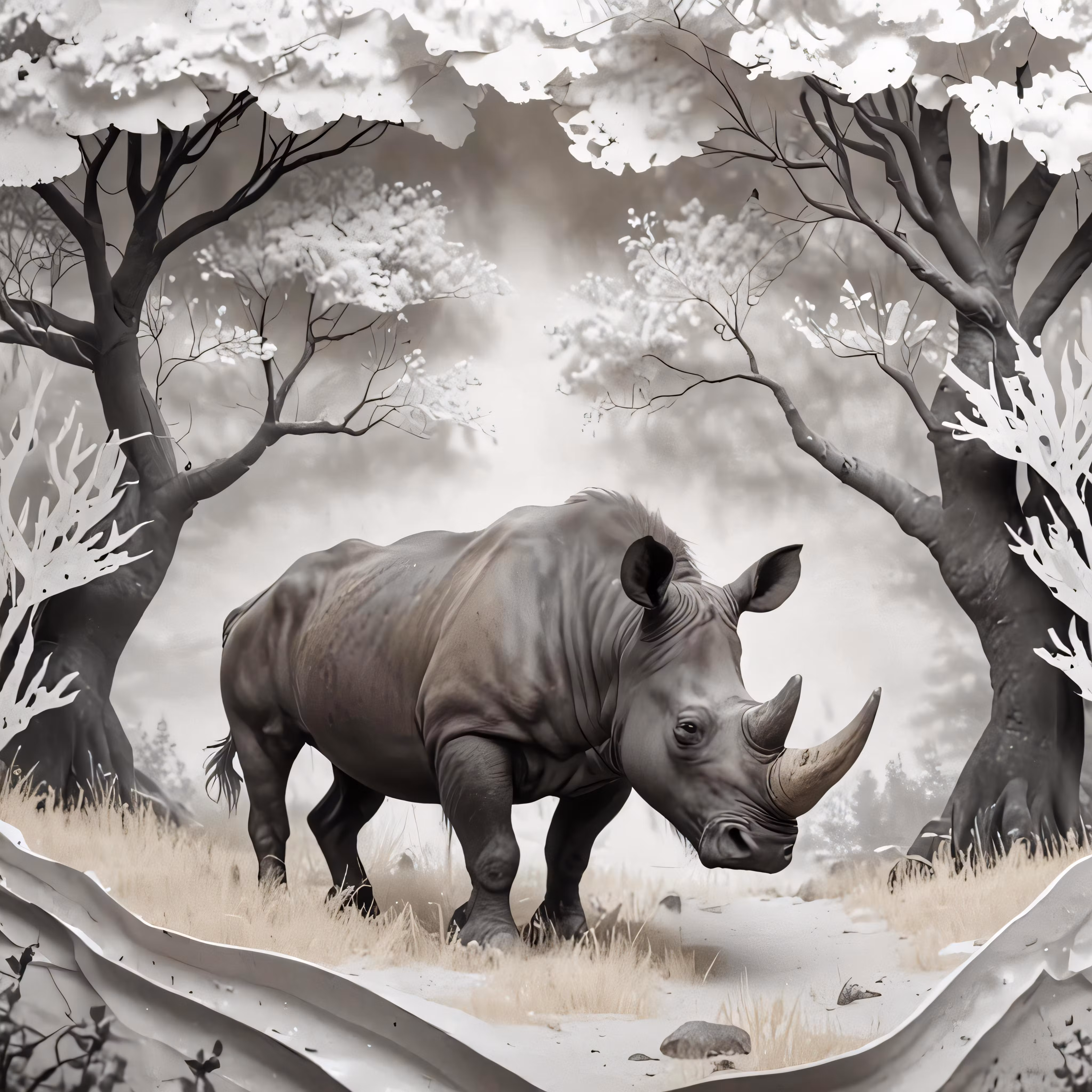 High resolution picture, free to use, a rhino is walking through a barren area