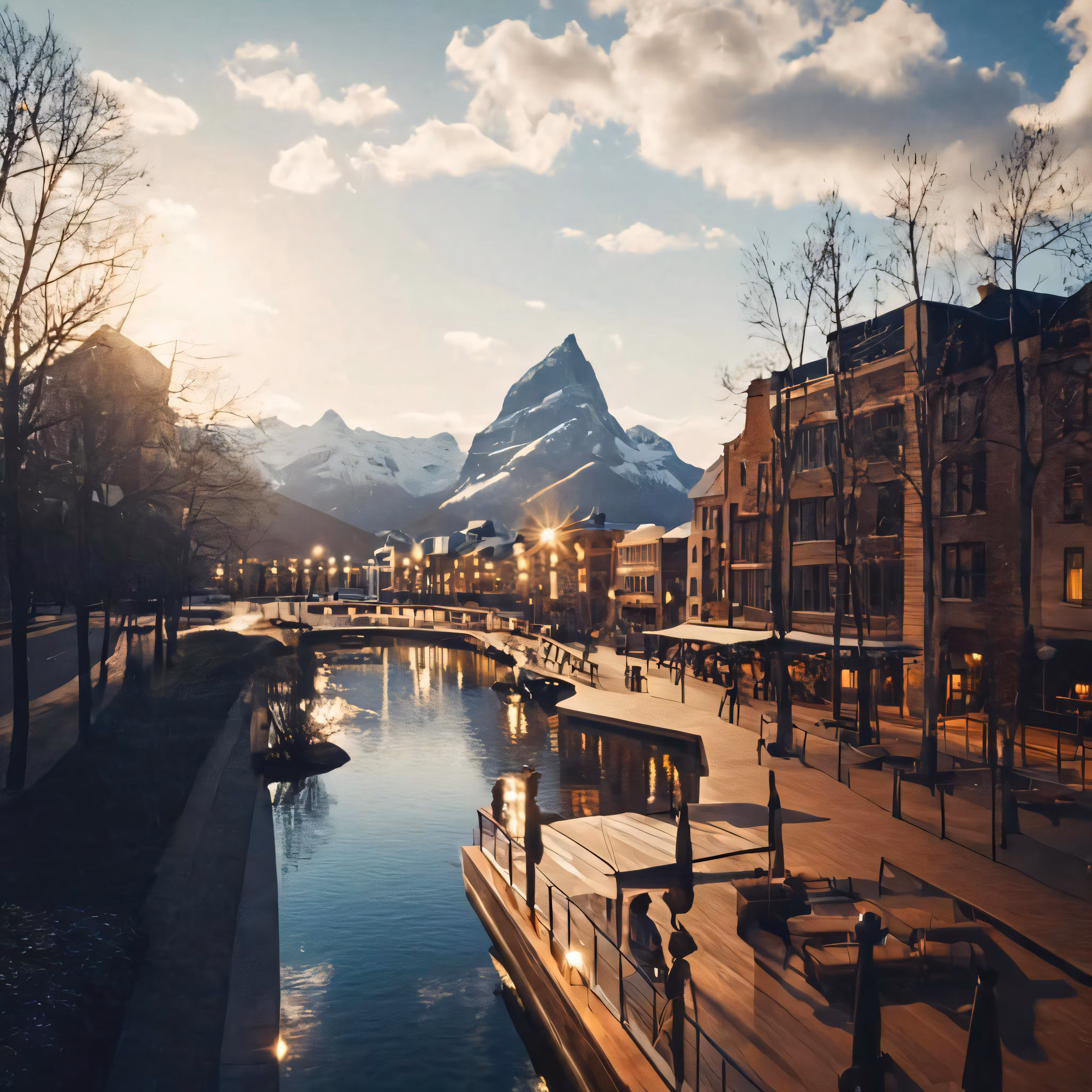 High resolution picture, free to use, a river runs through a city surrounded by mountains