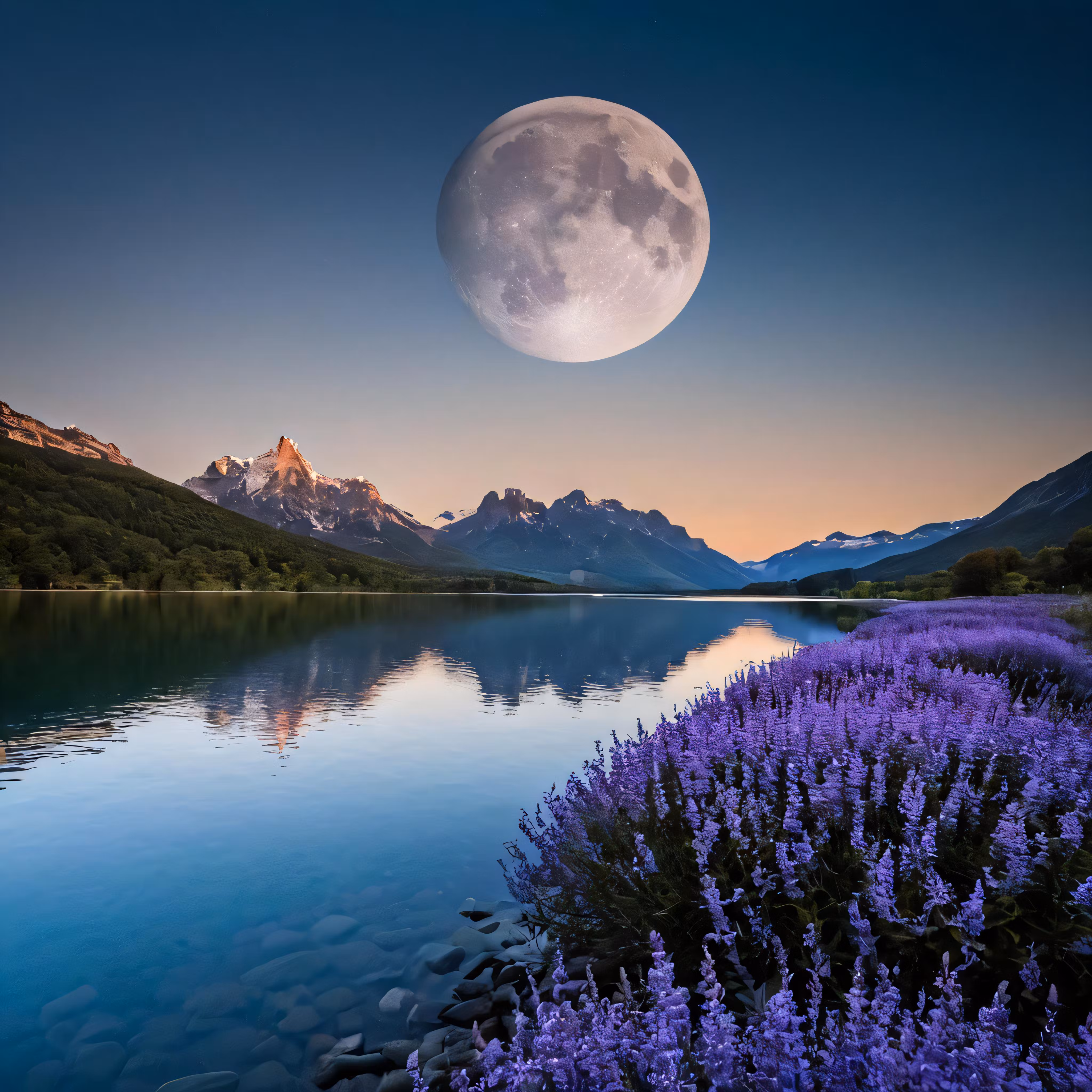 High resolution picture, free to use, a river with purple flowers on the banks at sunset