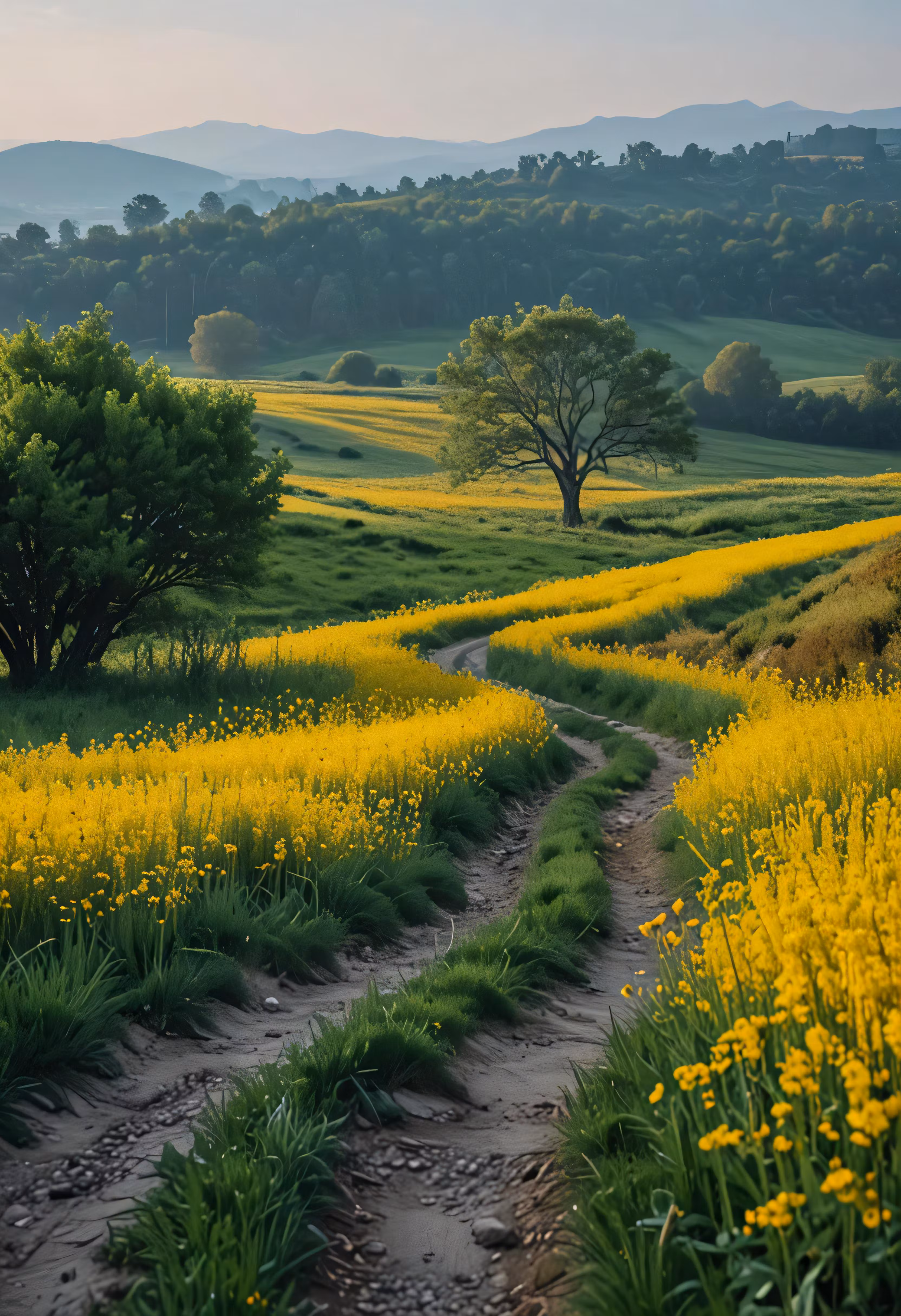 High resolution picture, free to use, a road in a beautiful green field with yellow flowers