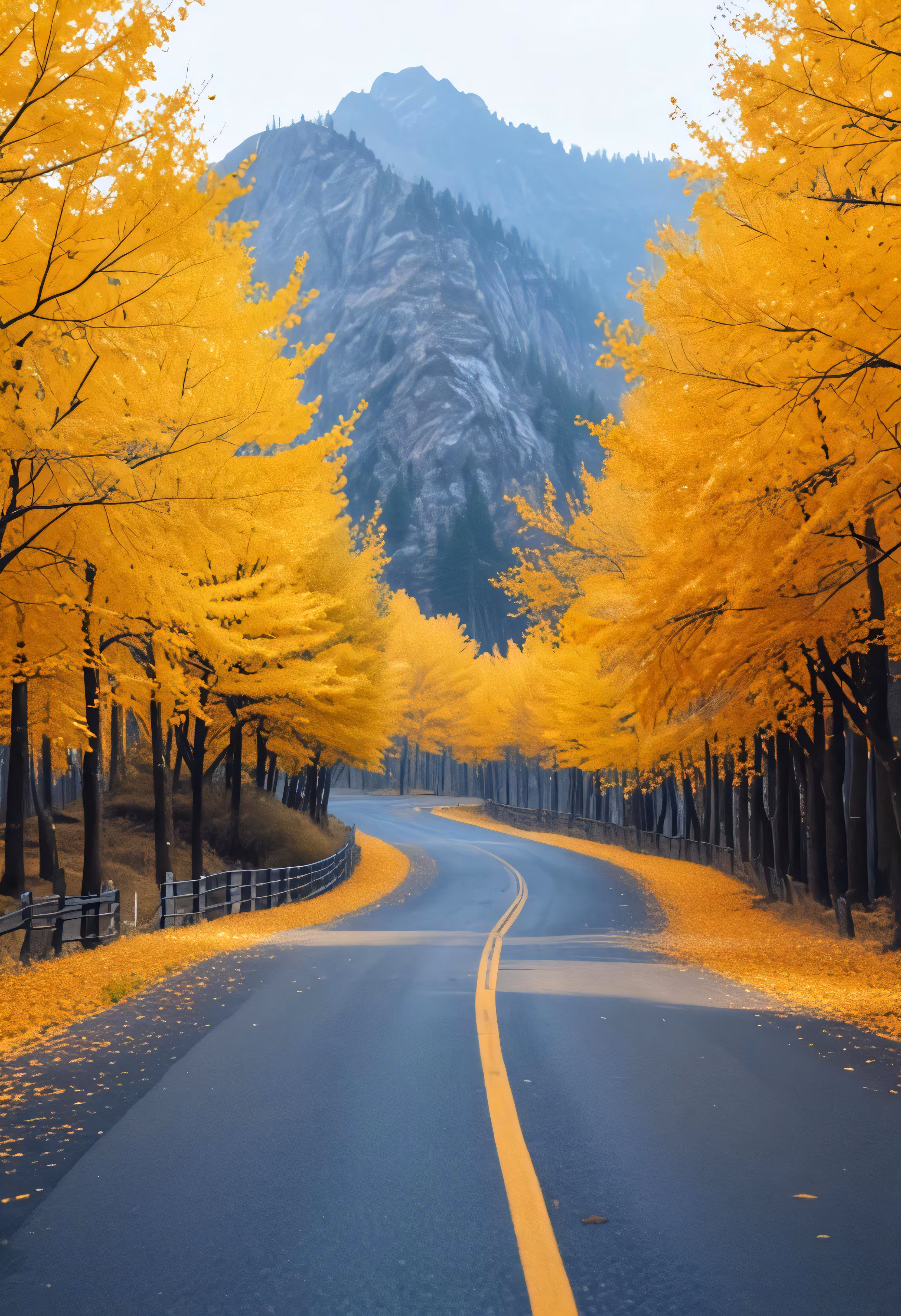 High resolution picture, free to use, a road in autumn with trees lined up all over the side