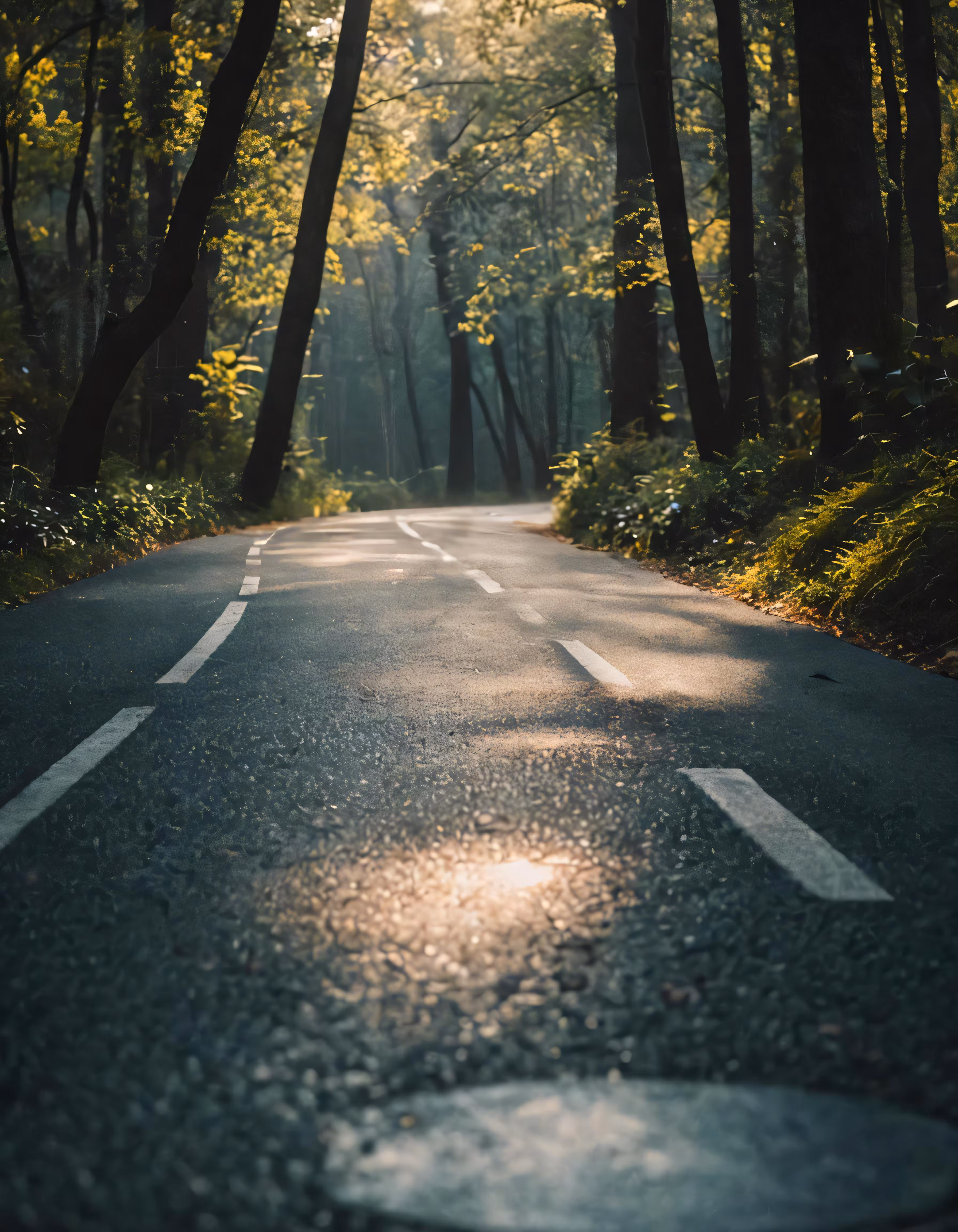 High resolution picture, free to use, a road lined with tall trees with the sun glaring through