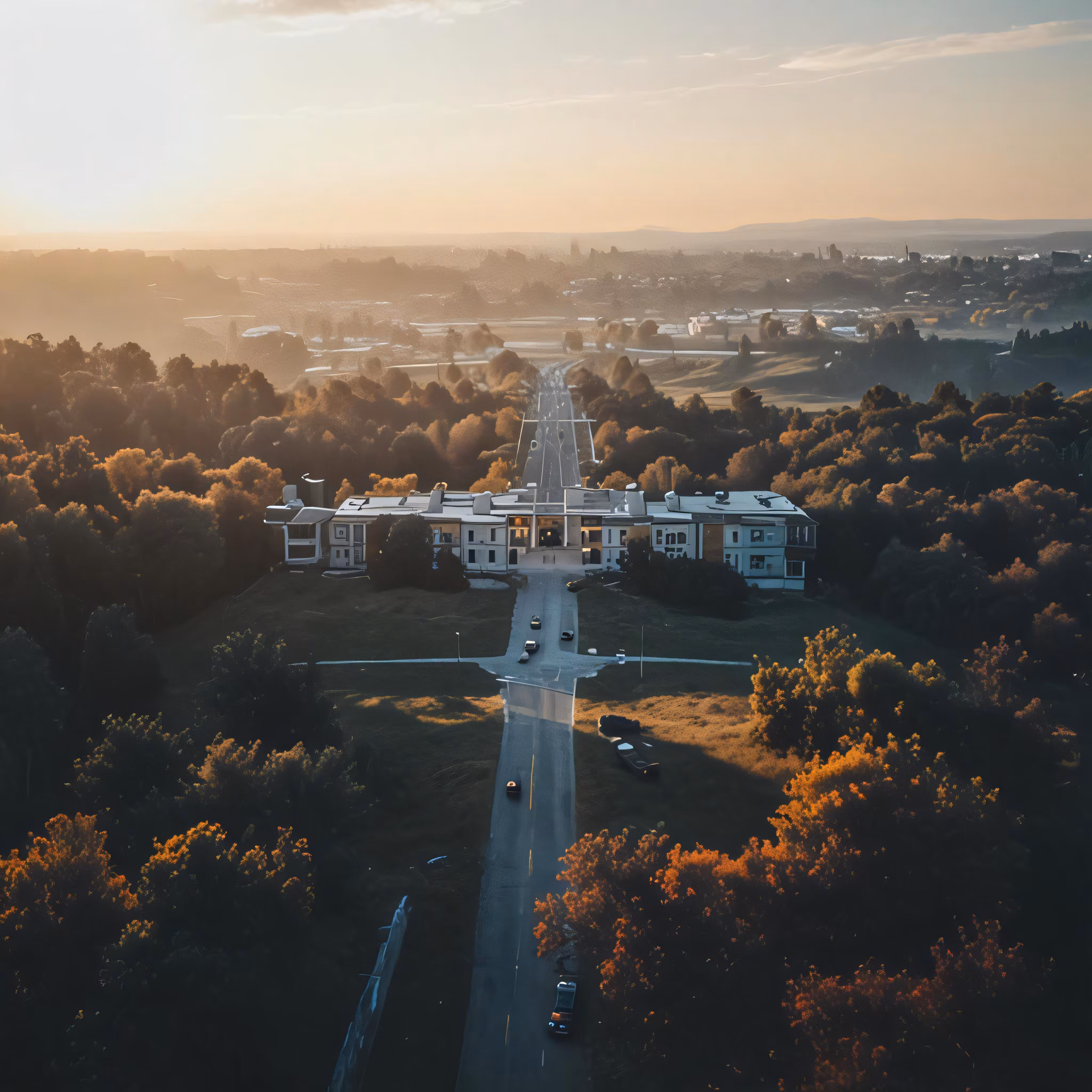 High resolution picture, free to use, a road running through an aerial view with the setting sun in the background