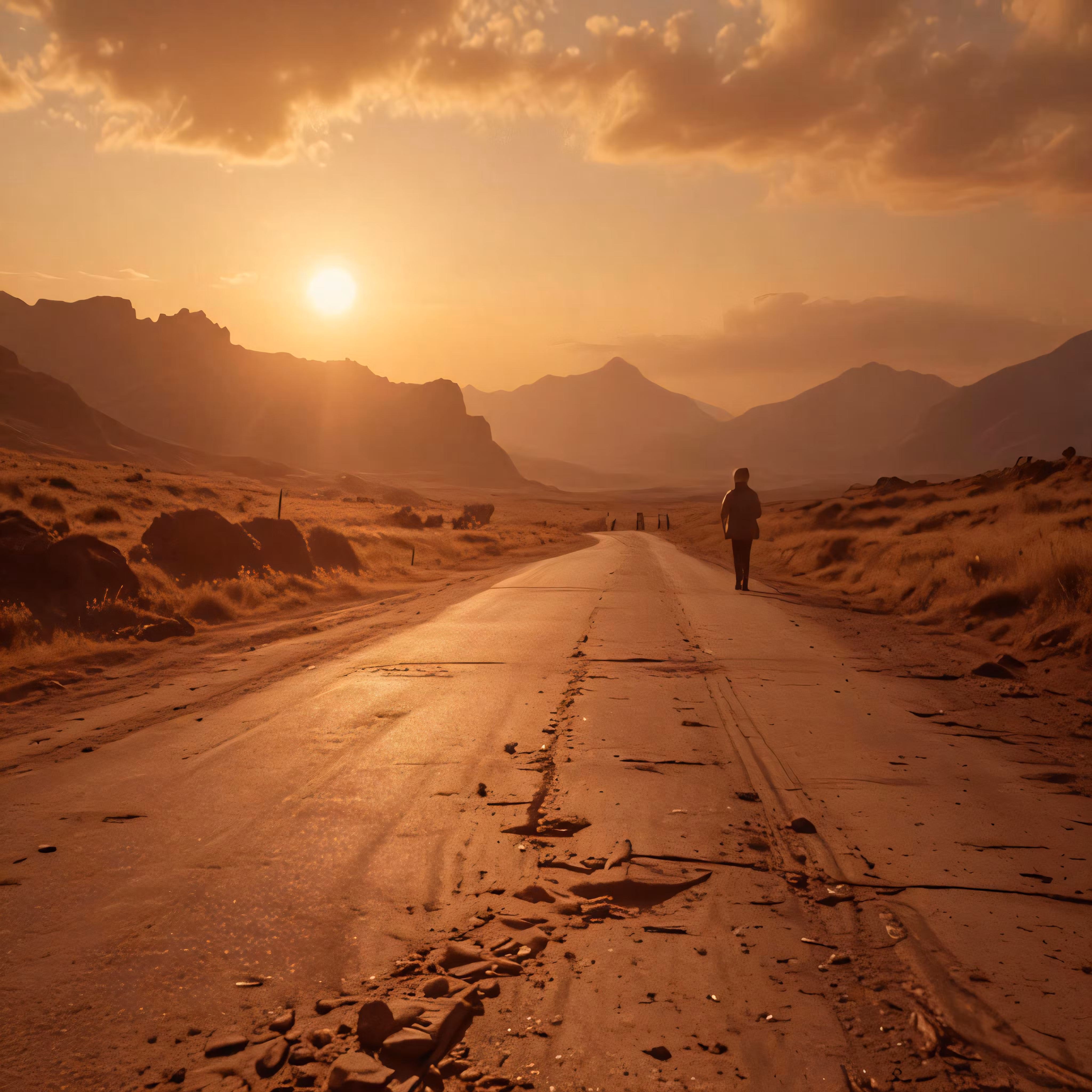 High resolution picture, free to use, a road with a man on it with a sunset in the background