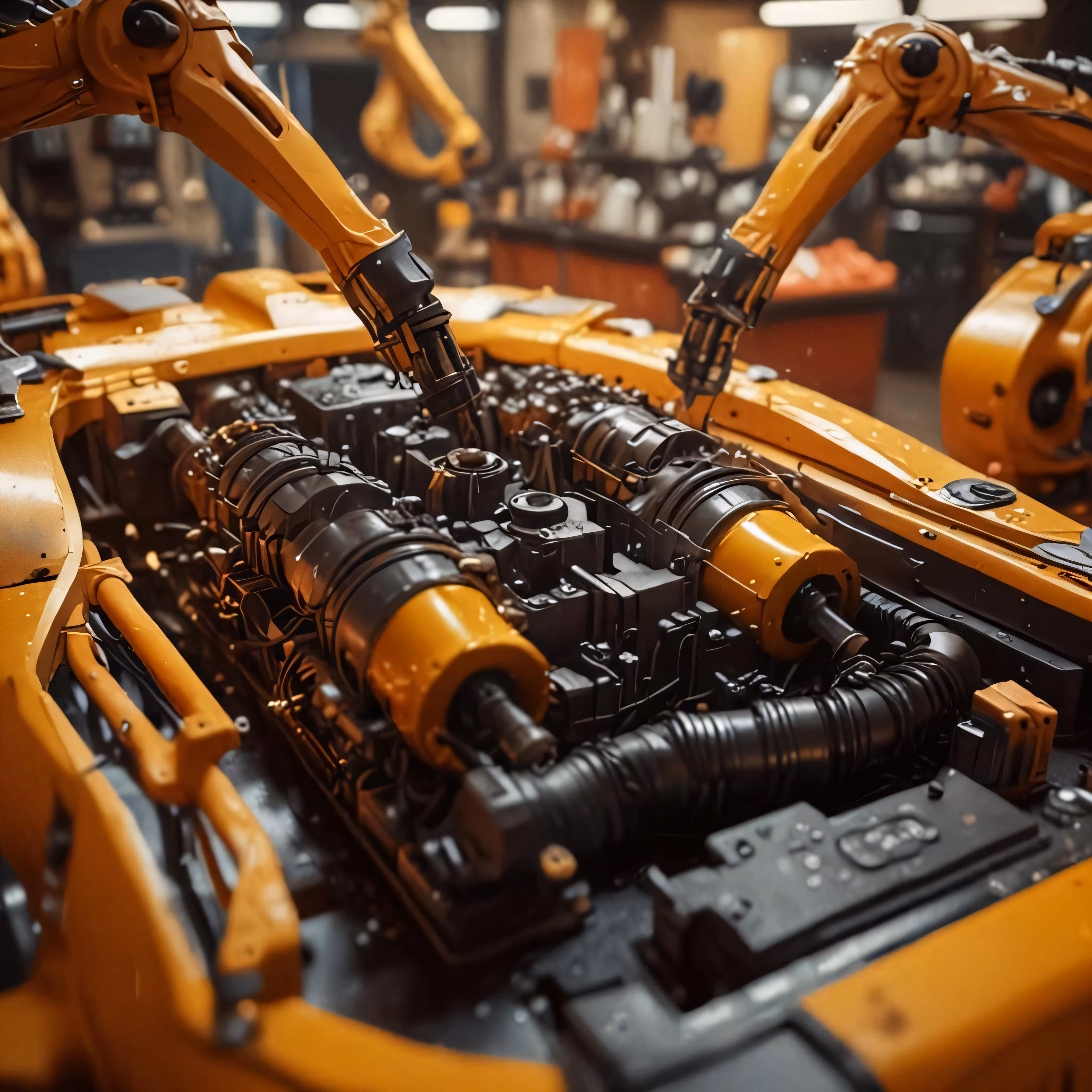 High resolution picture, free to use, a robot holding a machine behind a car with parts on it