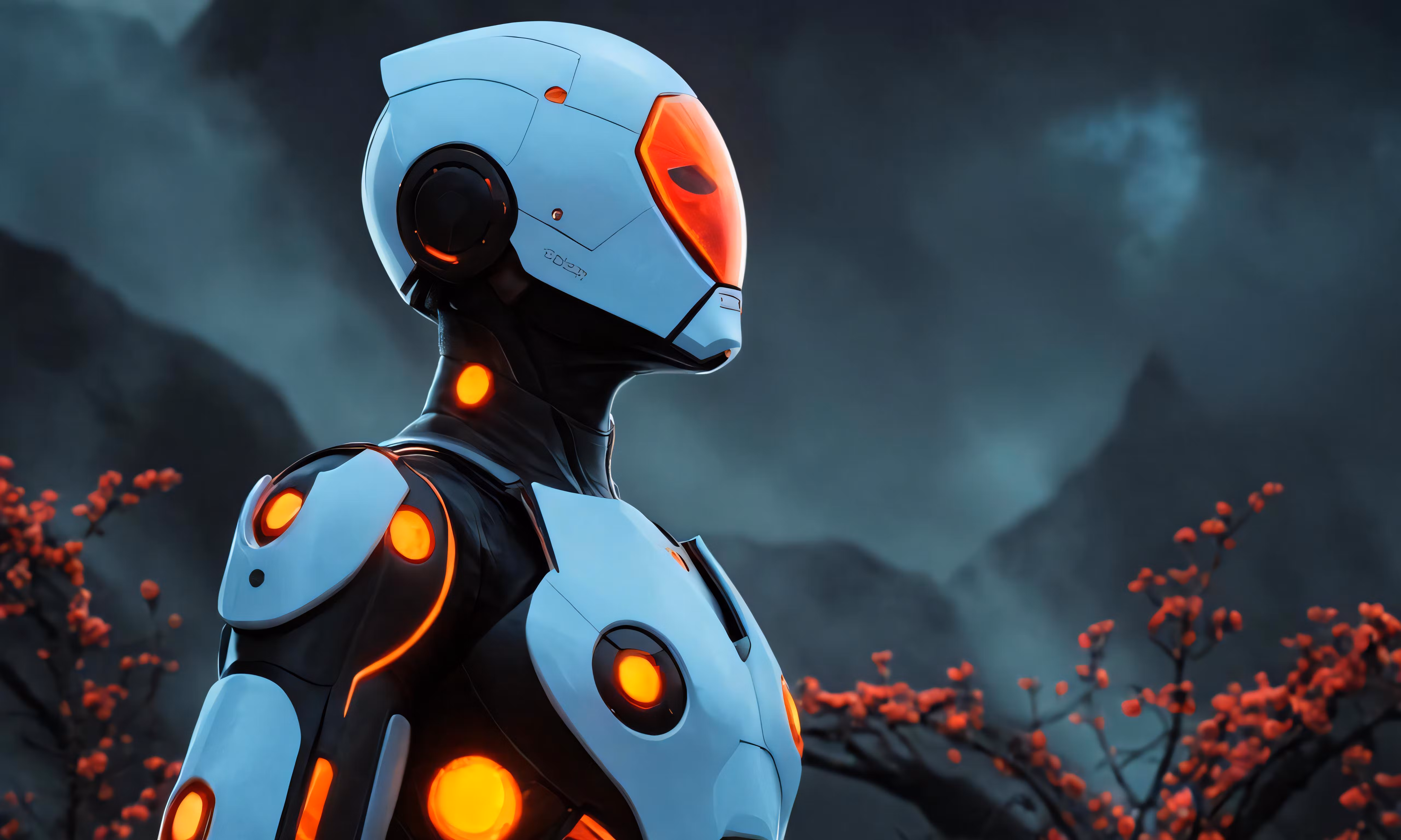 High resolution picture, free to use, a robot with orange eyes standing in front of trees