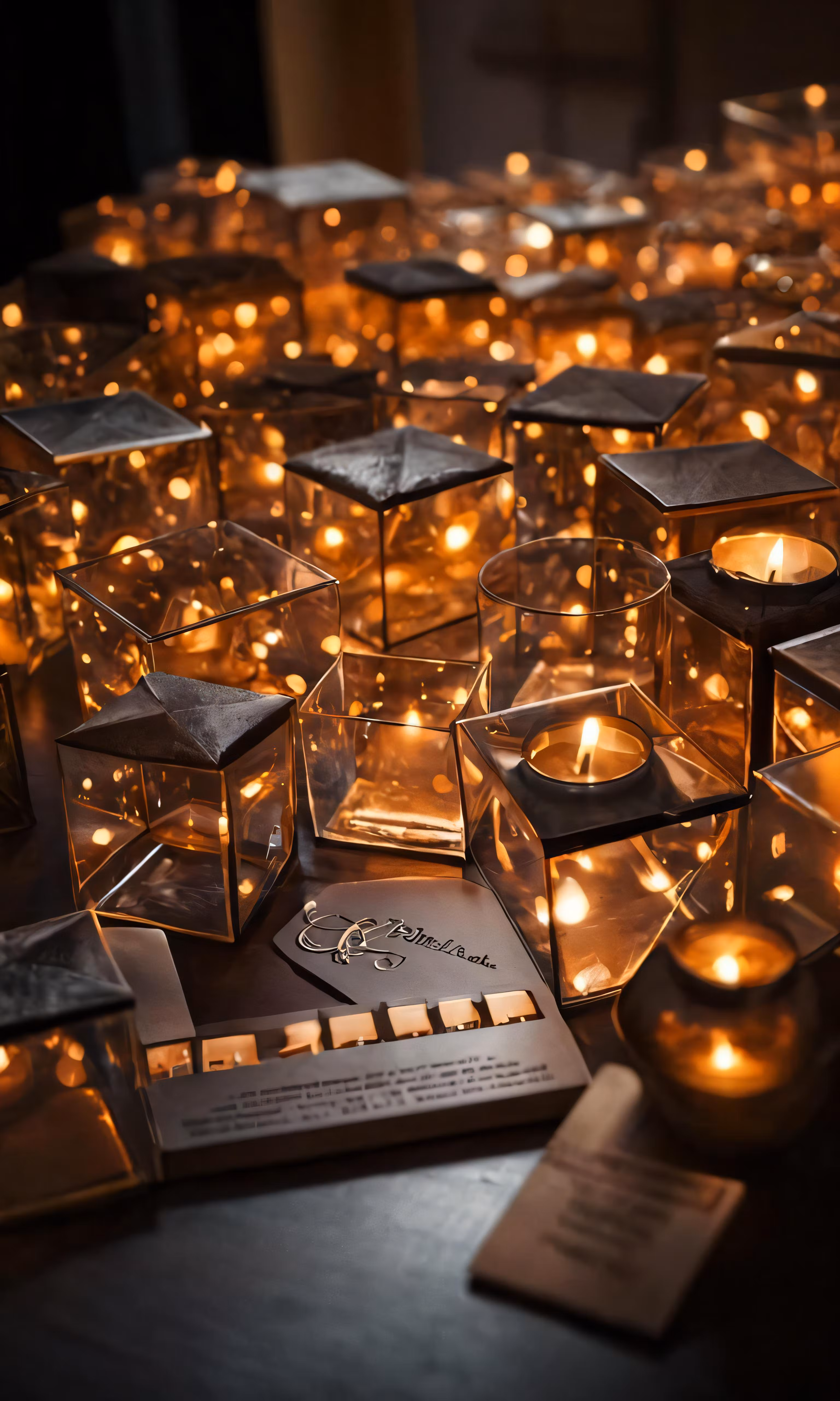 High resolution picture, free to use, a room full of lit candles surrounded by small boxes
