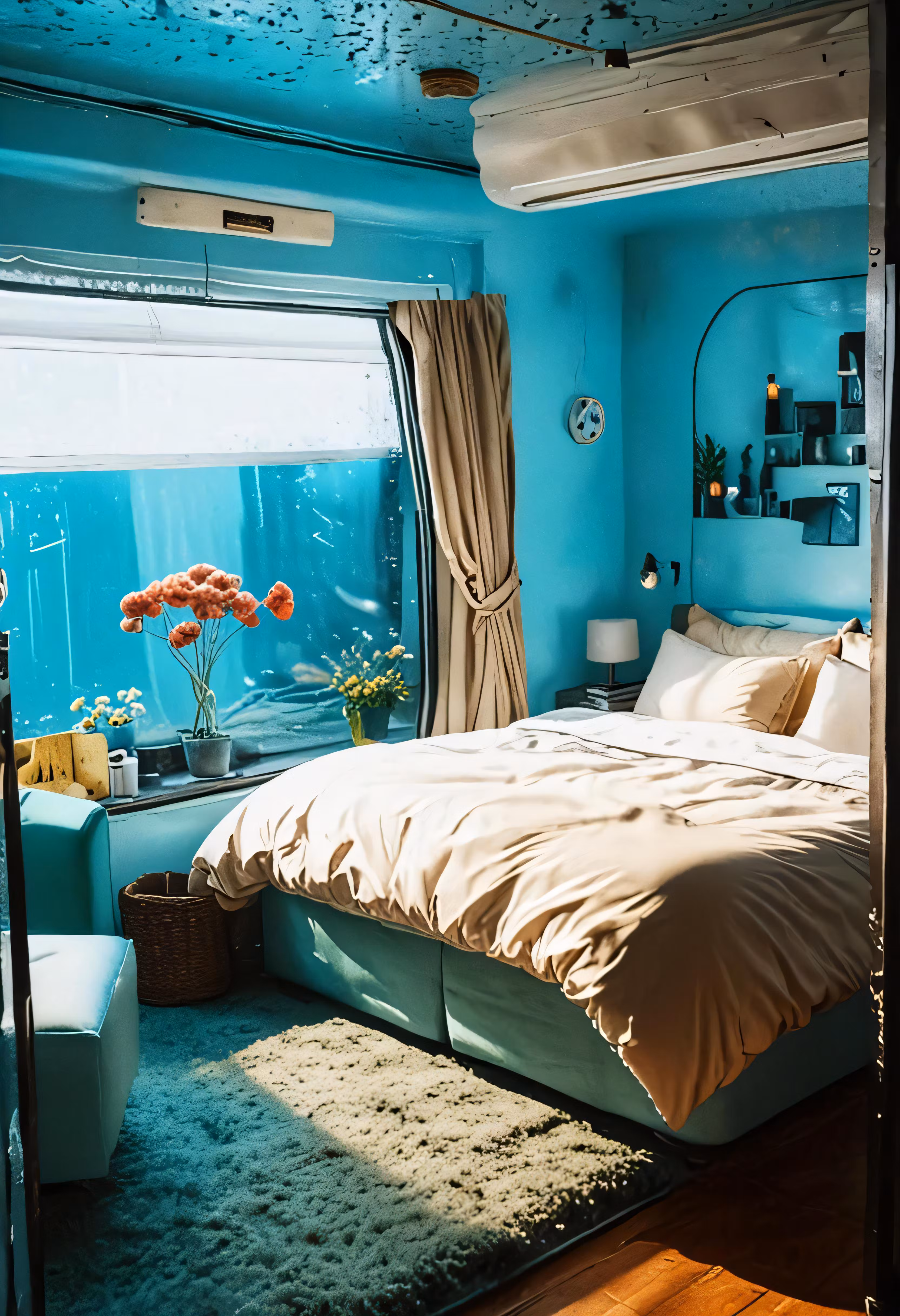 High resolution picture, free to use, a room that has some big bed and a fish tank in the wall