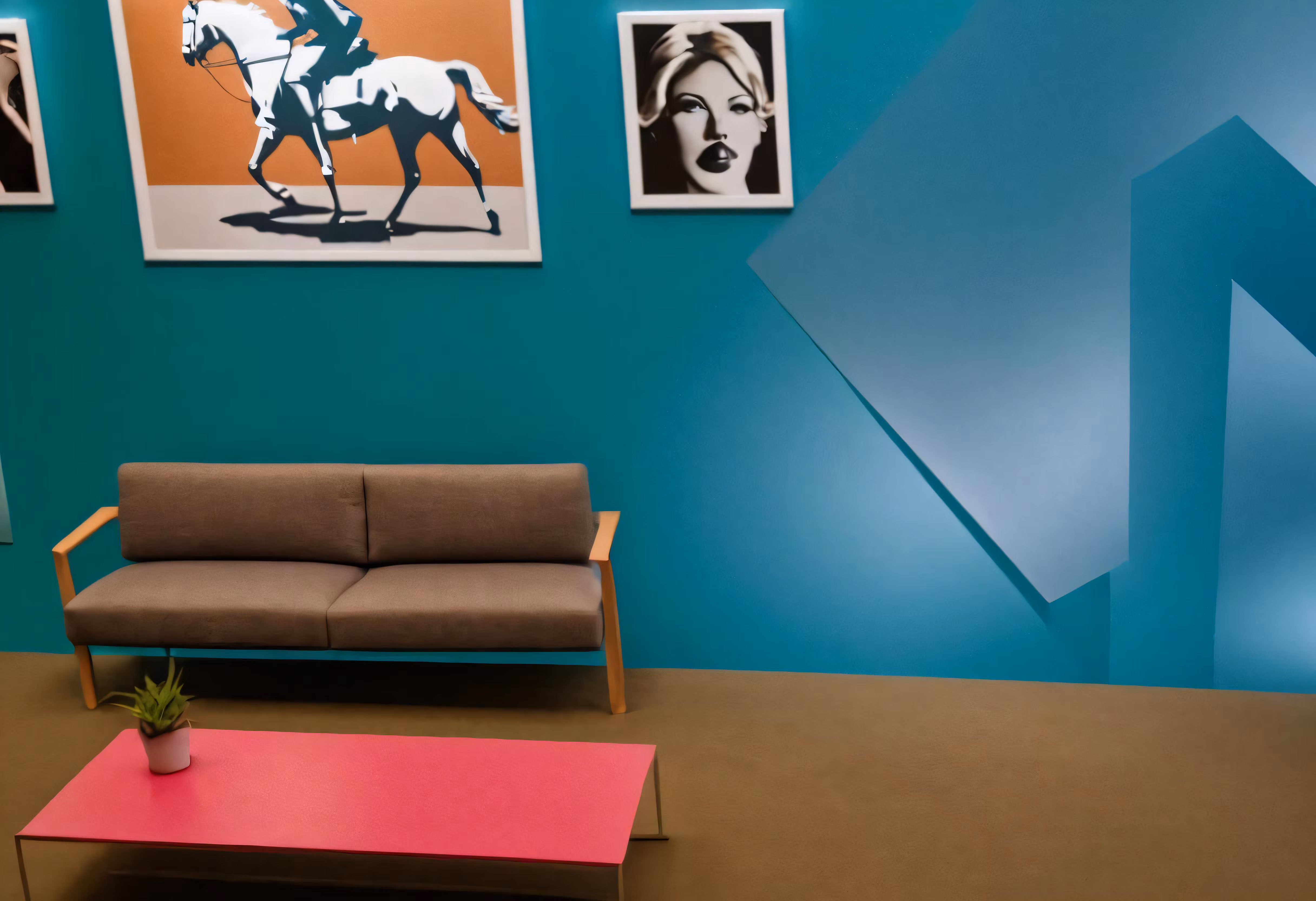 High resolution picture, free to use, a room with a sofa and art on the wall