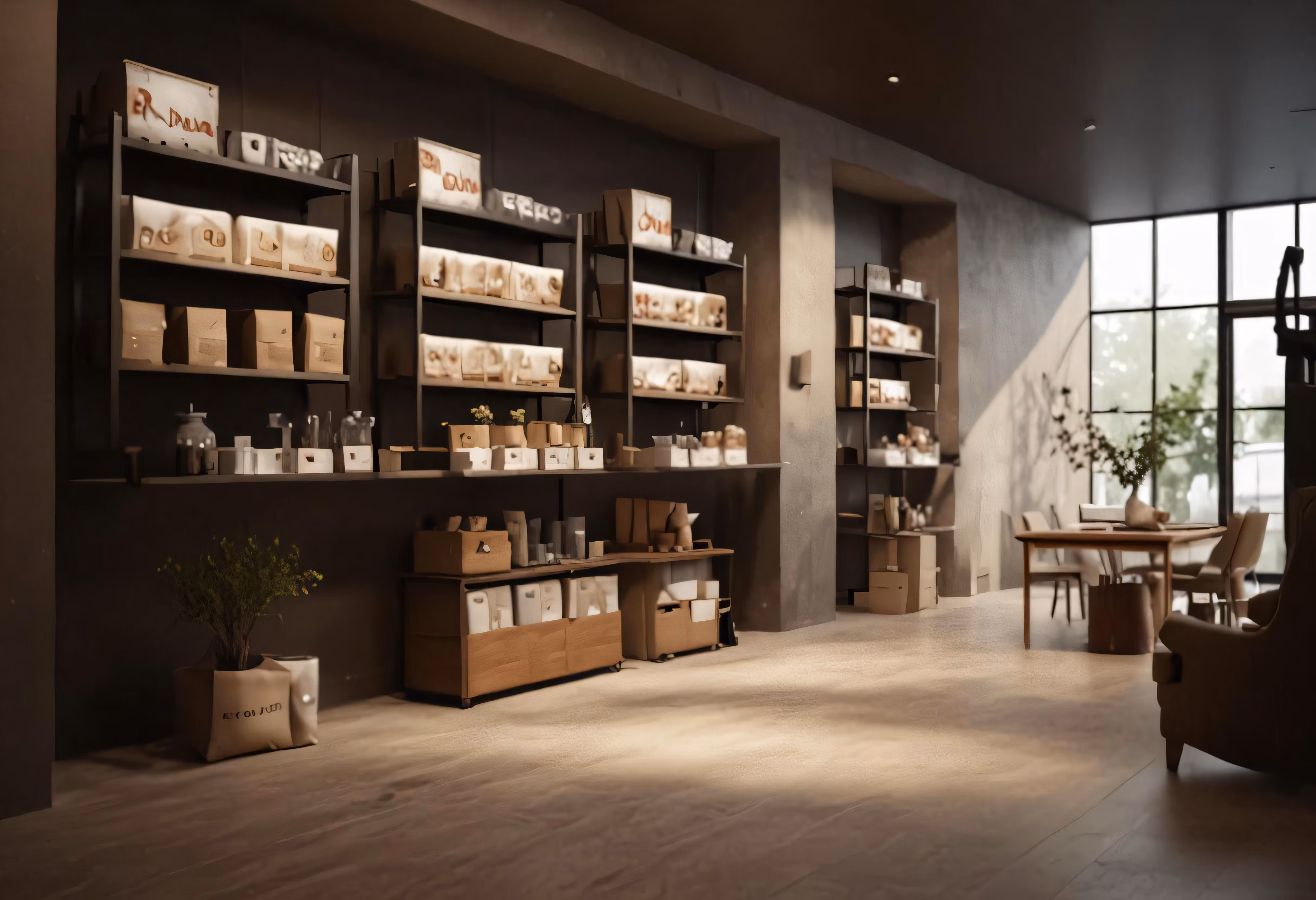 High resolution picture, free to use, a room with shelves and several boxes that have products in them