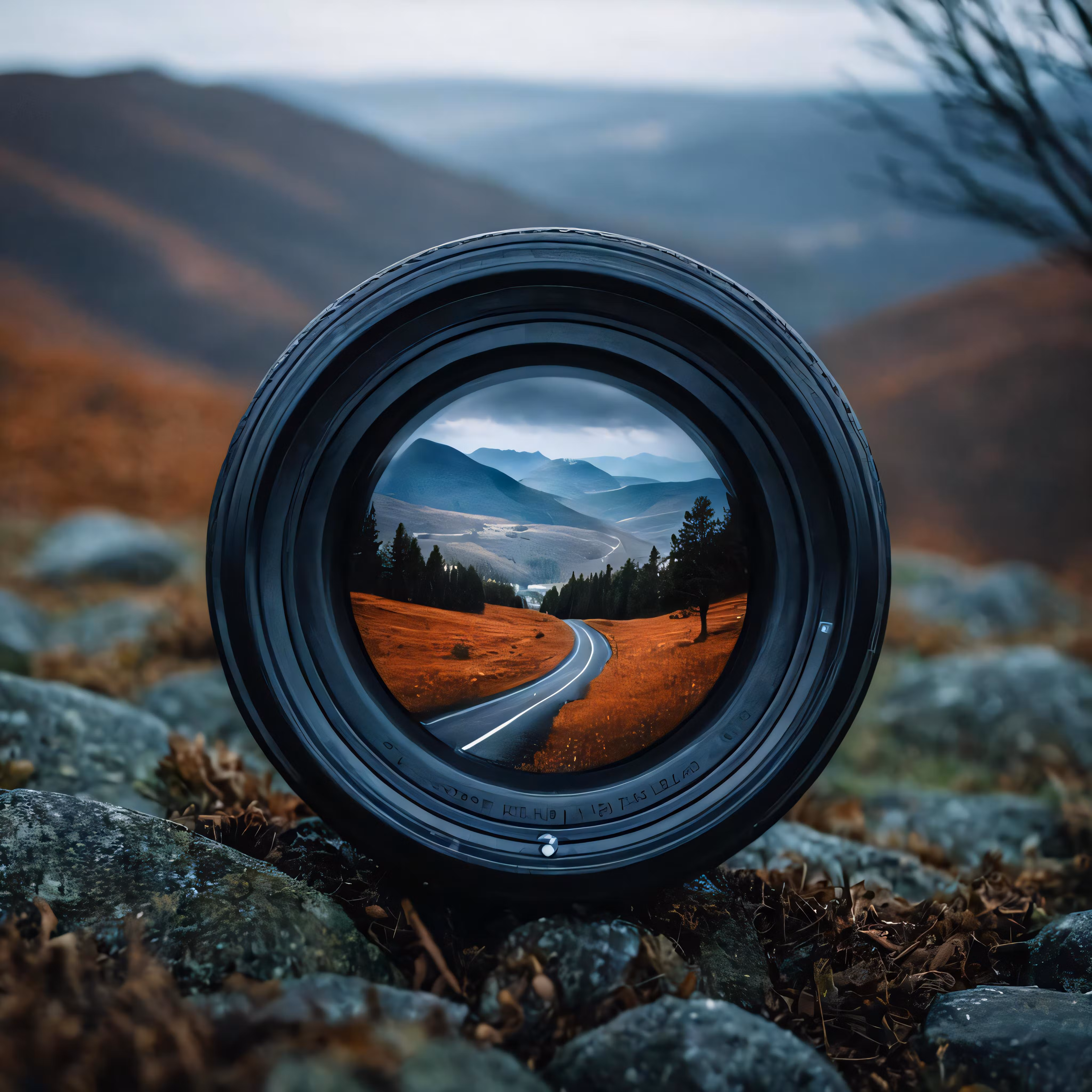 High resolution picture, free to use, a round lens sitting on the ground in front of a scenic mountain