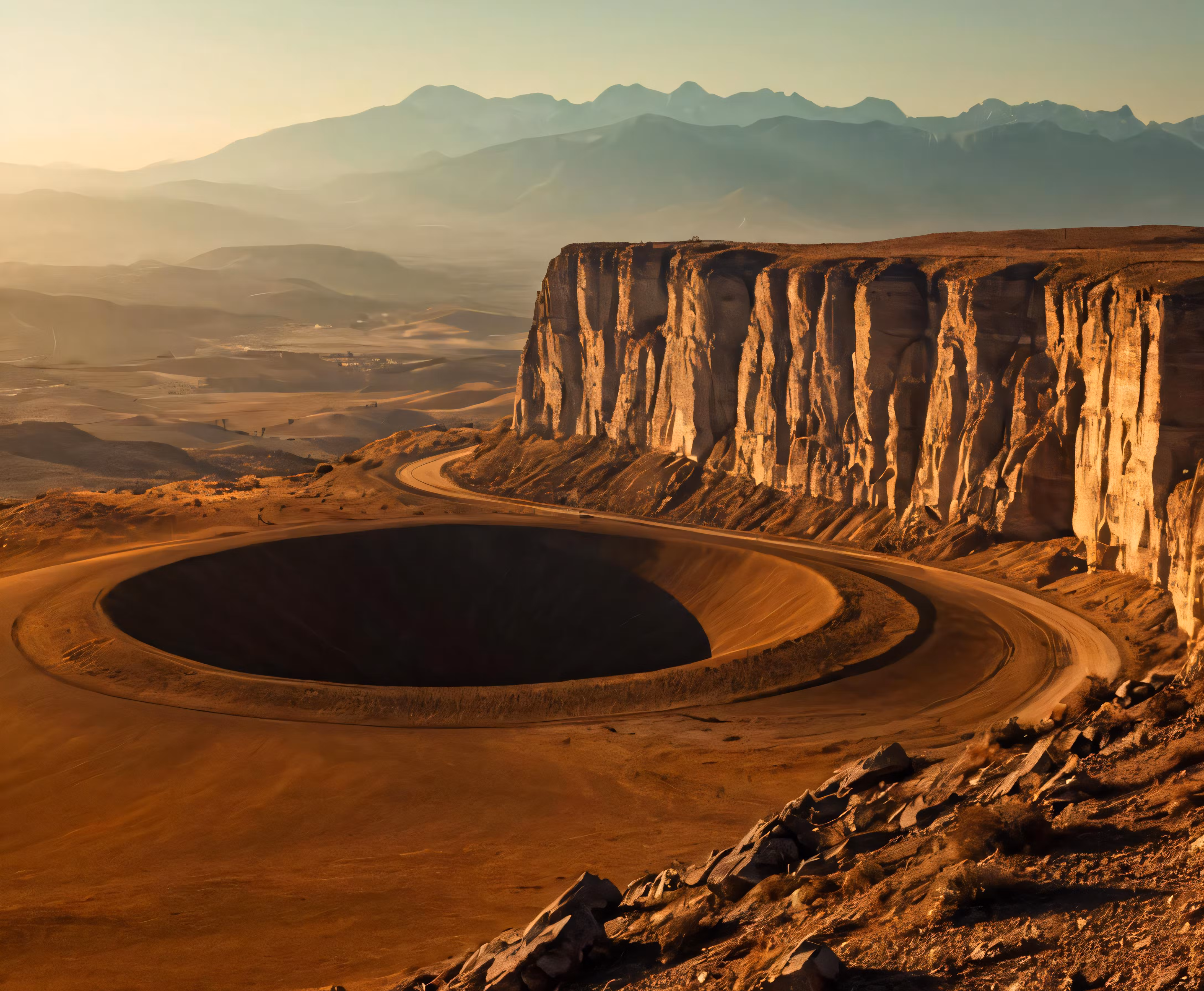 High resolution picture, free to use, a round road in the middle of an arid valley