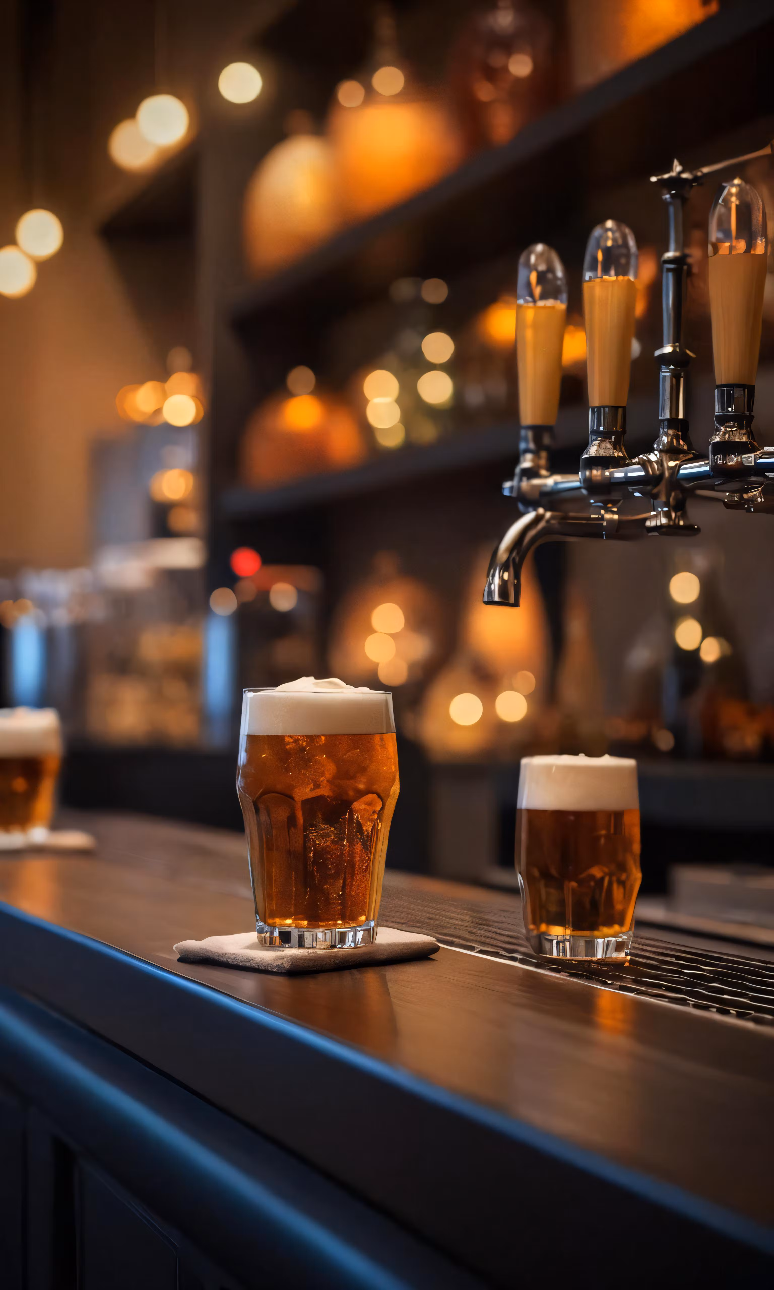 High resolution picture, free to use, a row of beers sitting on top of a bar next to a laptop