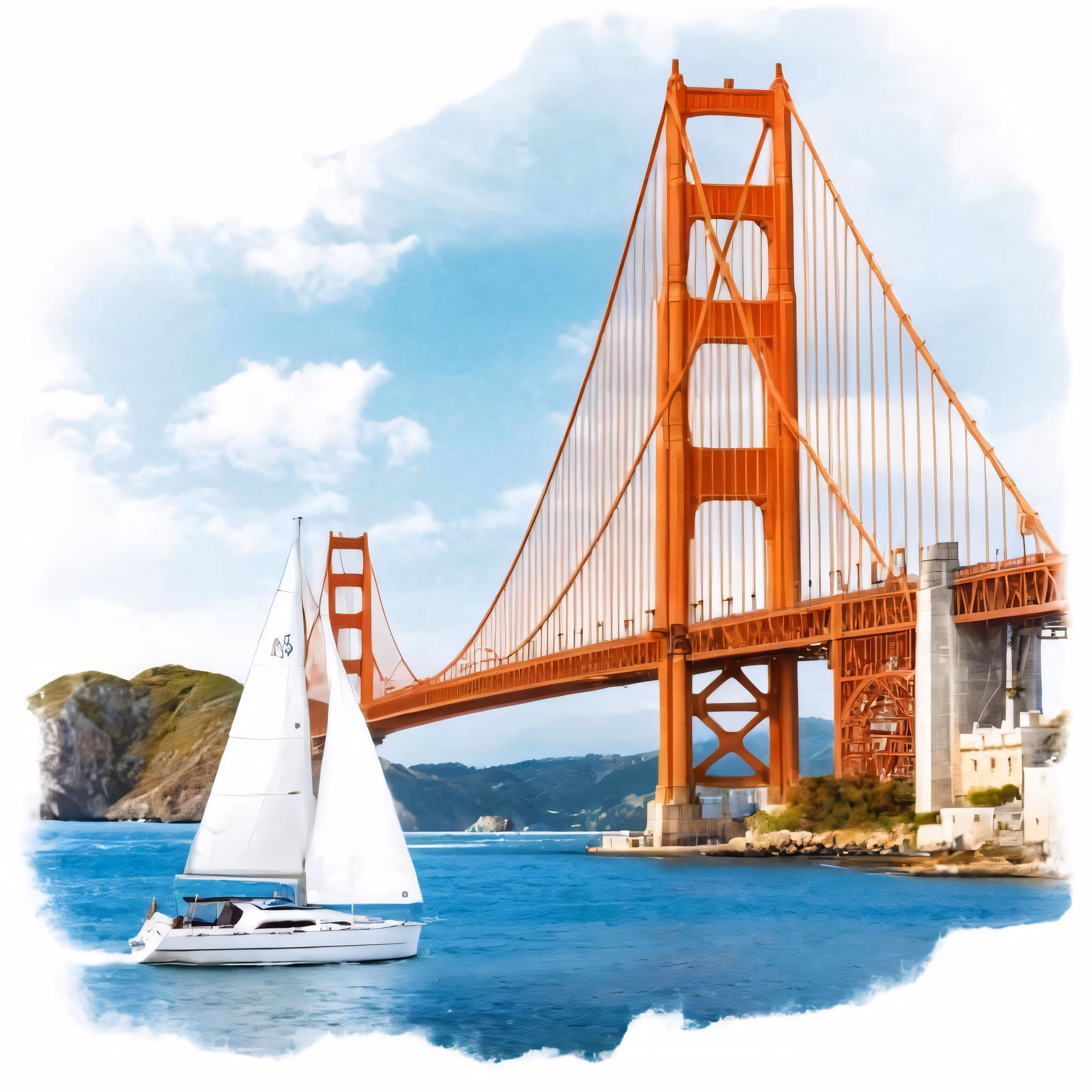 High resolution picture, free to use, a sailboat passing underneath the golden gate bridge