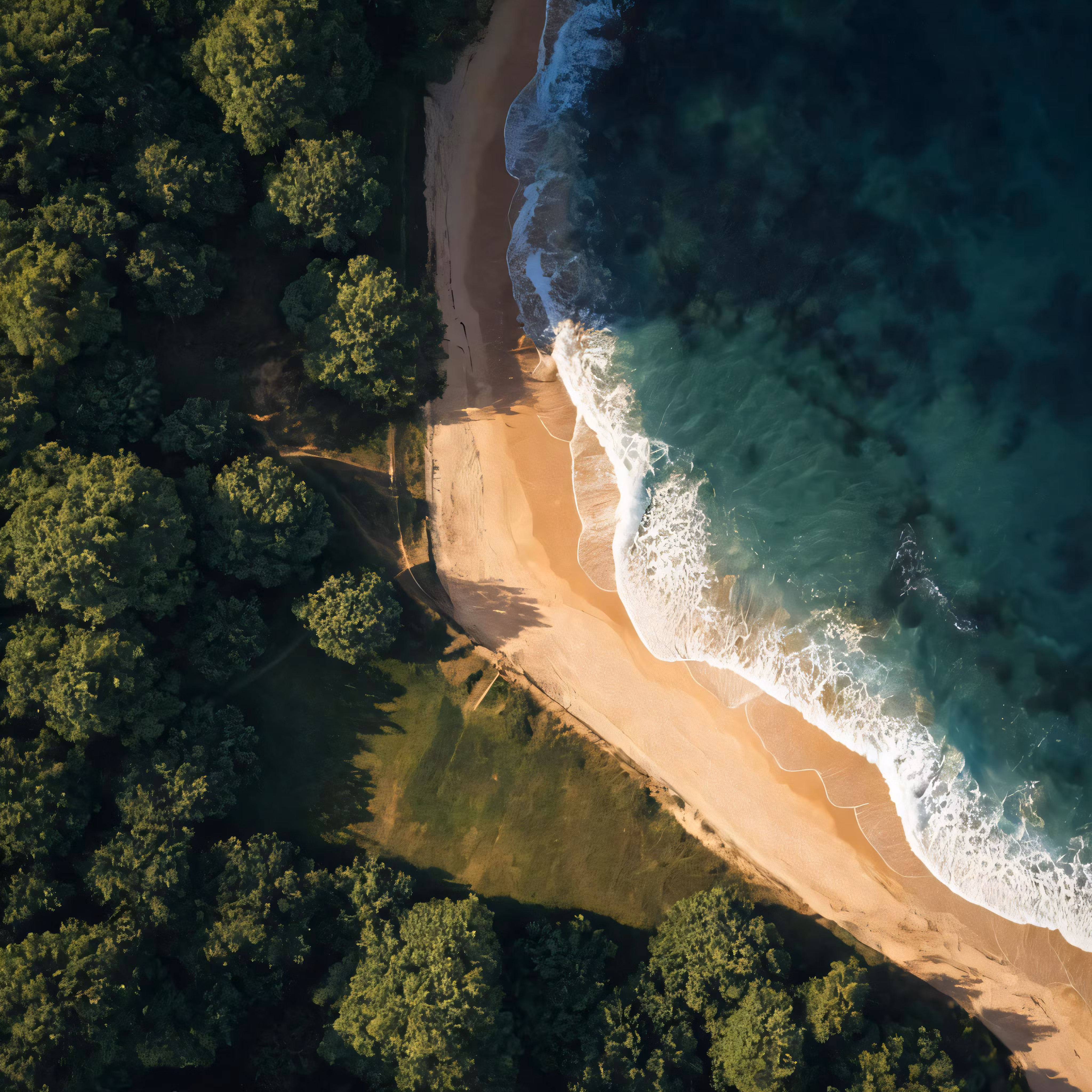 High resolution picture, free to use, a sandy beach, blue waters and forest around