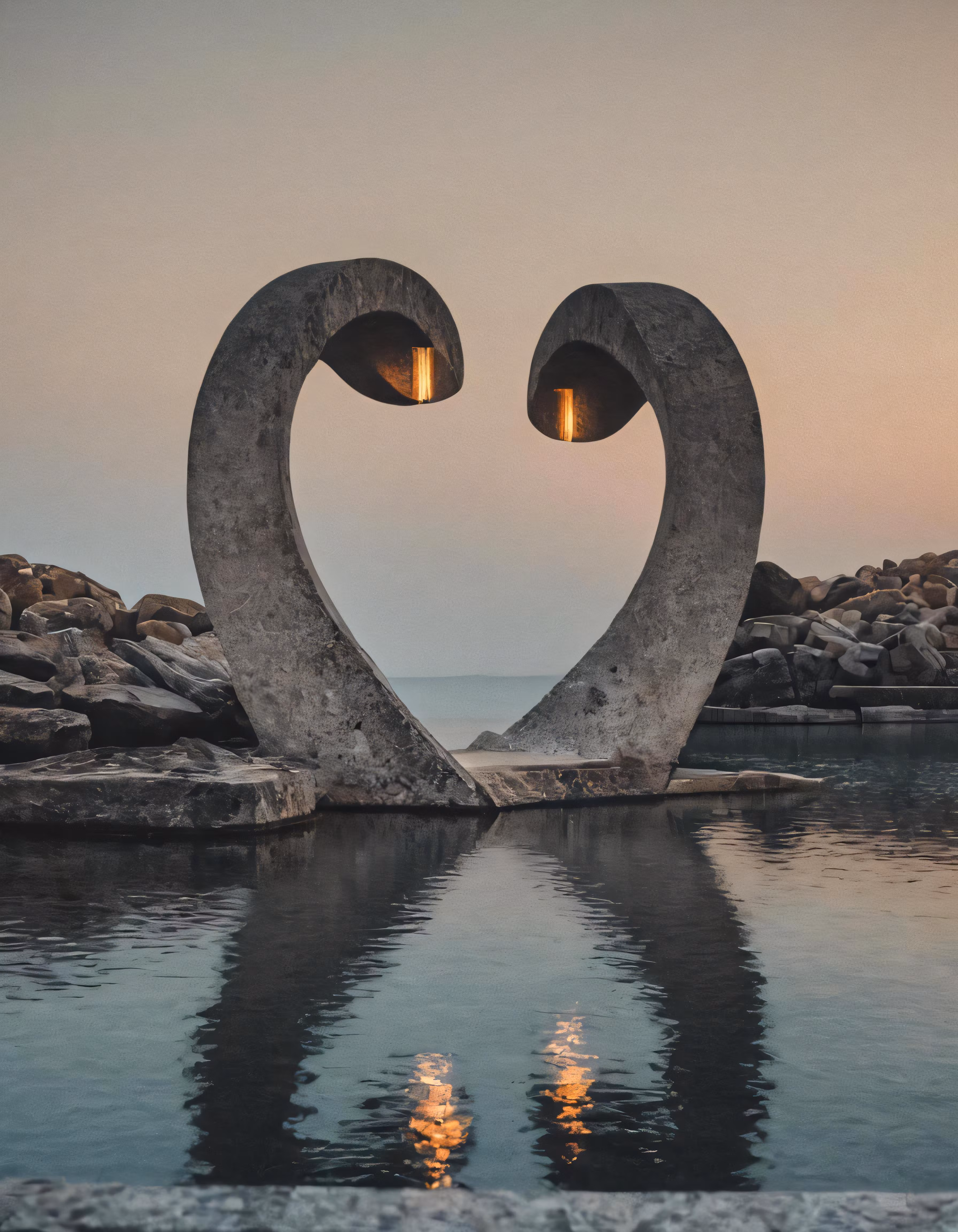 High resolution picture, free to use, a sculpture made of two small lamps next to some water