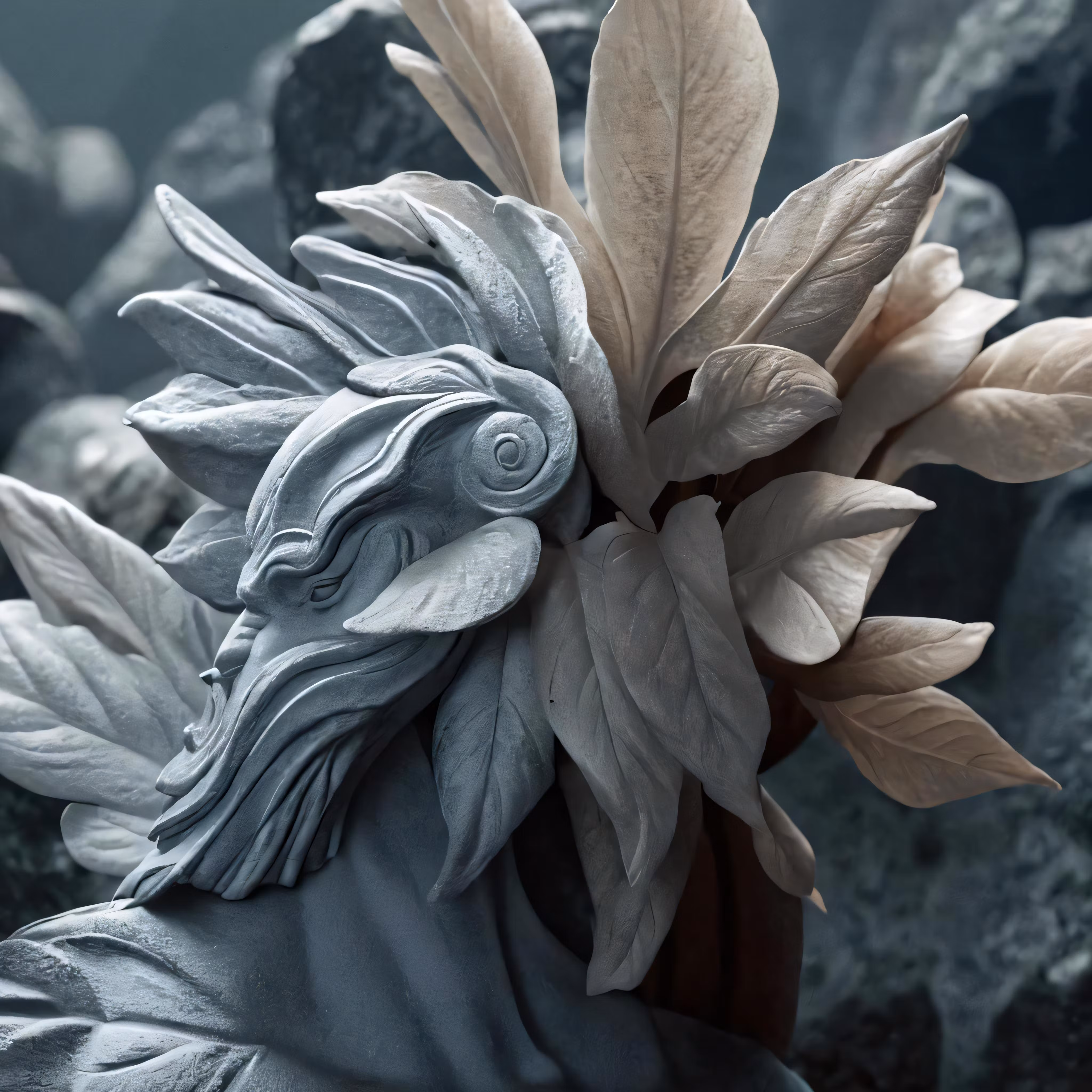 High resolution picture, free to use, a sculpture of a horse with foliage on its head