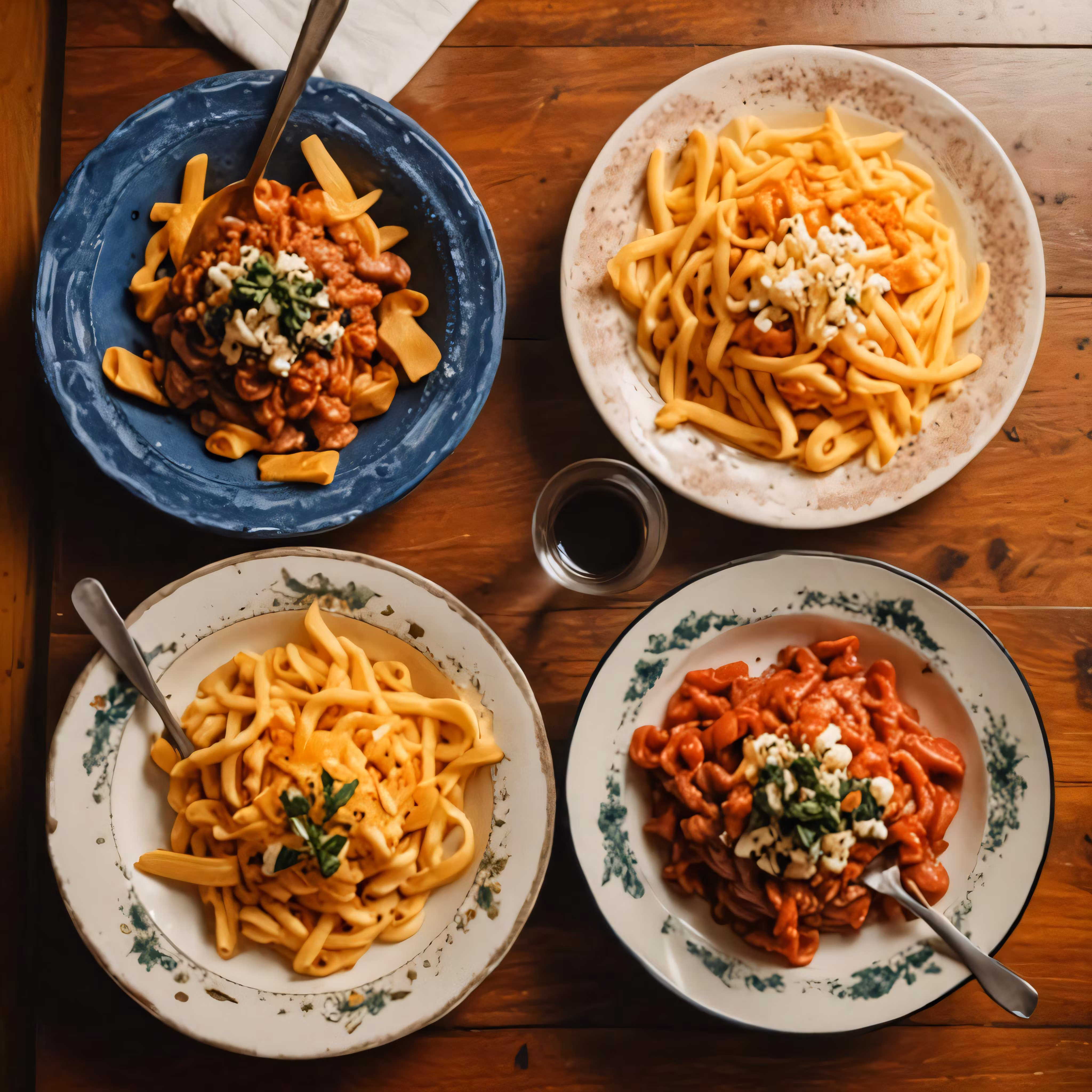 High resolution picture, free to use, a set of three plates of pasta on a wooden table