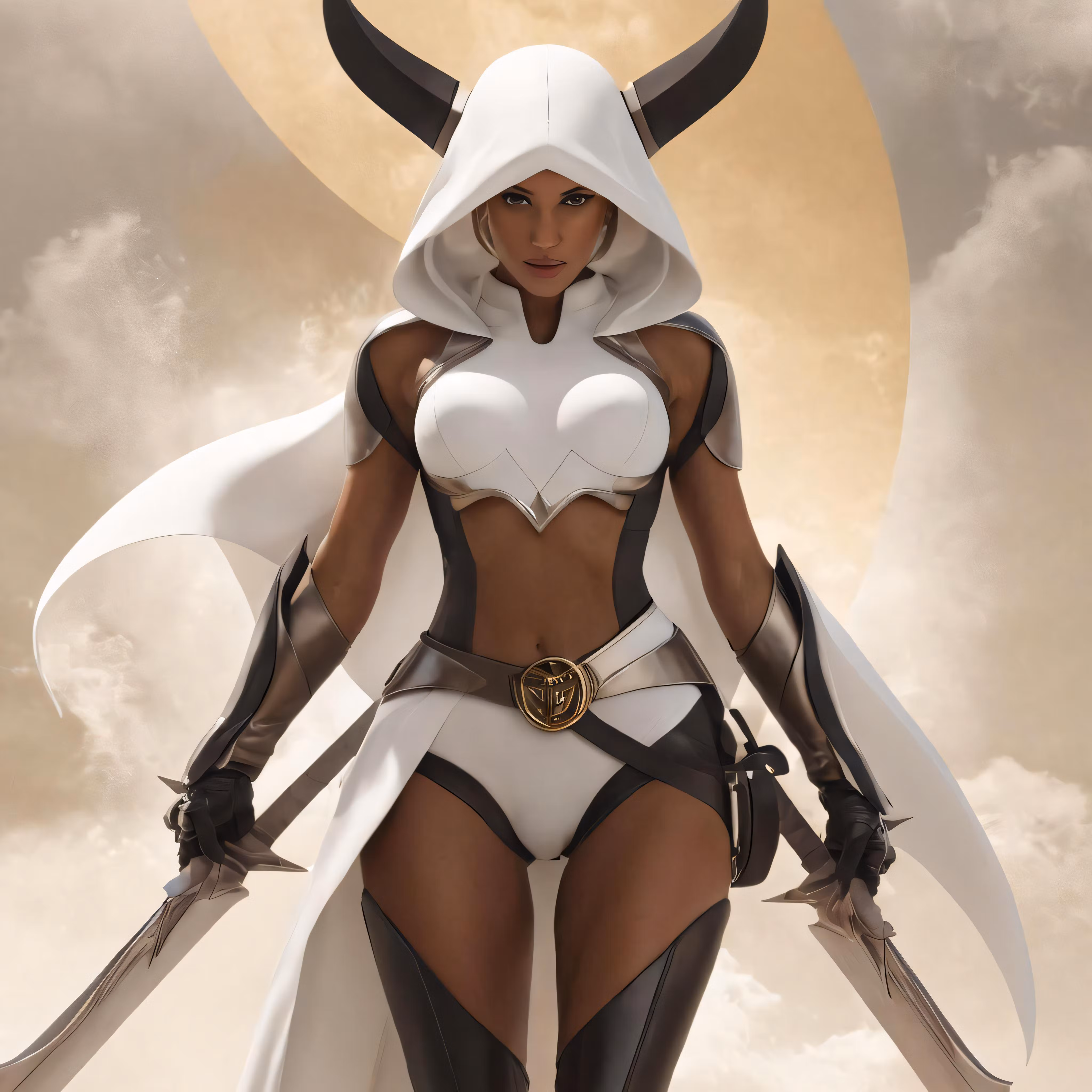 High resolution picture, free to use, a sexy women dressed in white is holding sword and knife