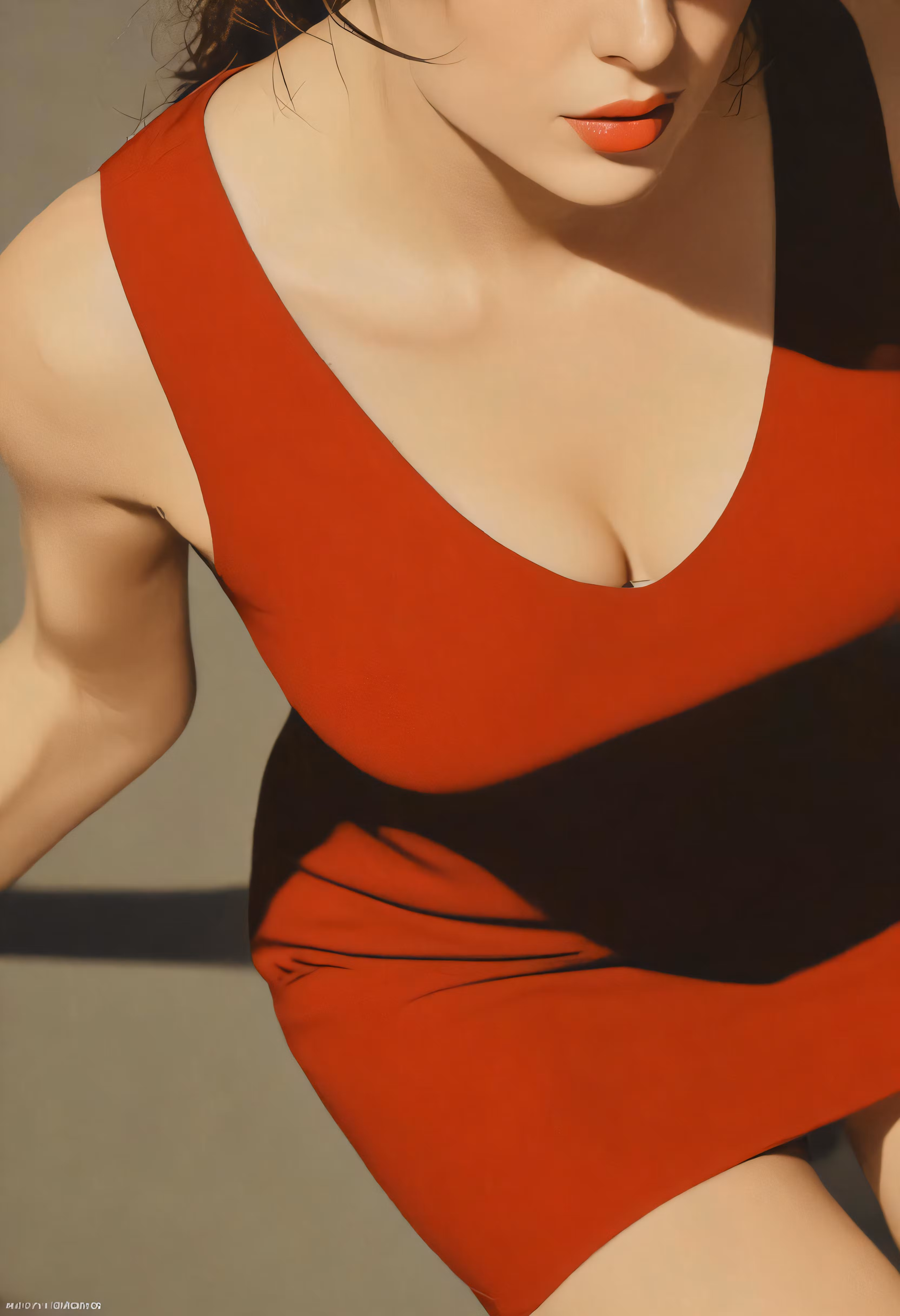 High resolution picture, free to use, a sexy young woman in a red bodysuit posing