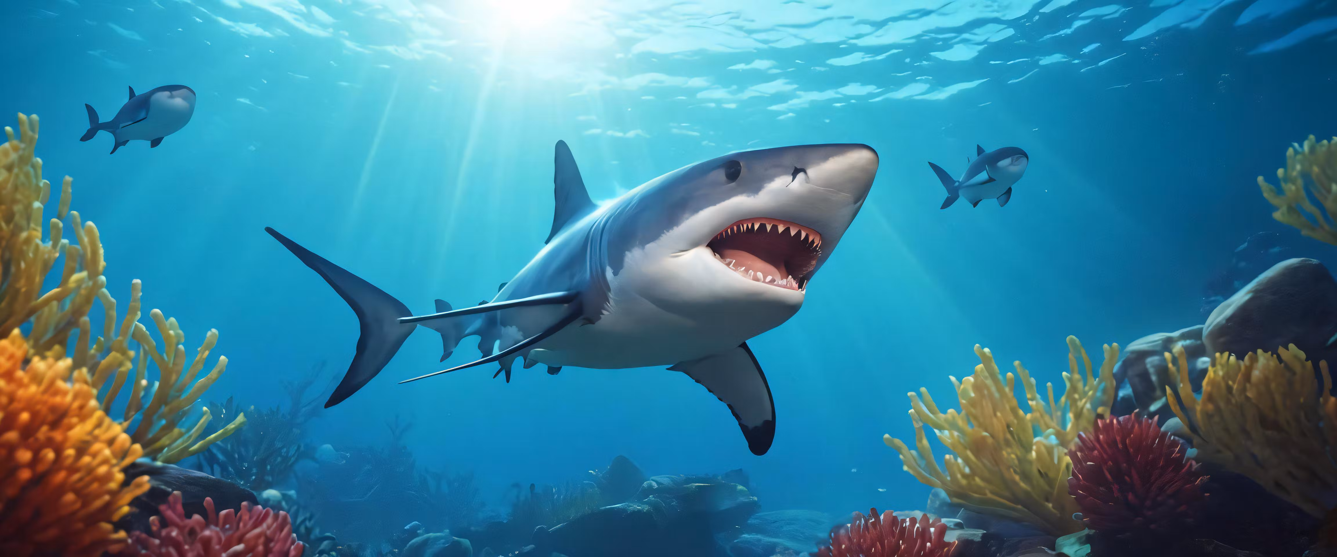 High resolution picture, free to use, a shark with open mouth on the ocean with scubas in the background