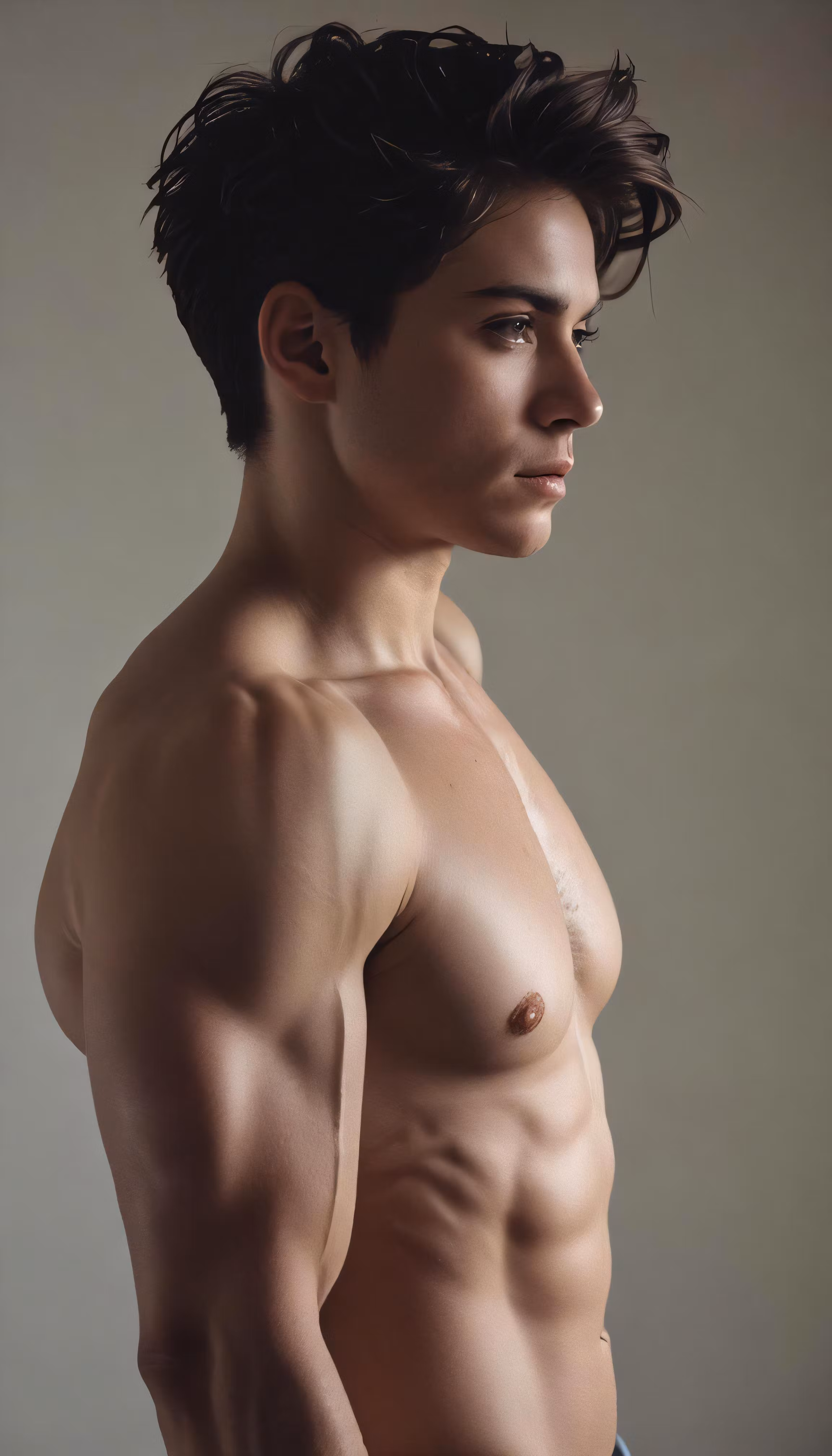 High resolution picture, free to use, a shirtless man is looking off to the side